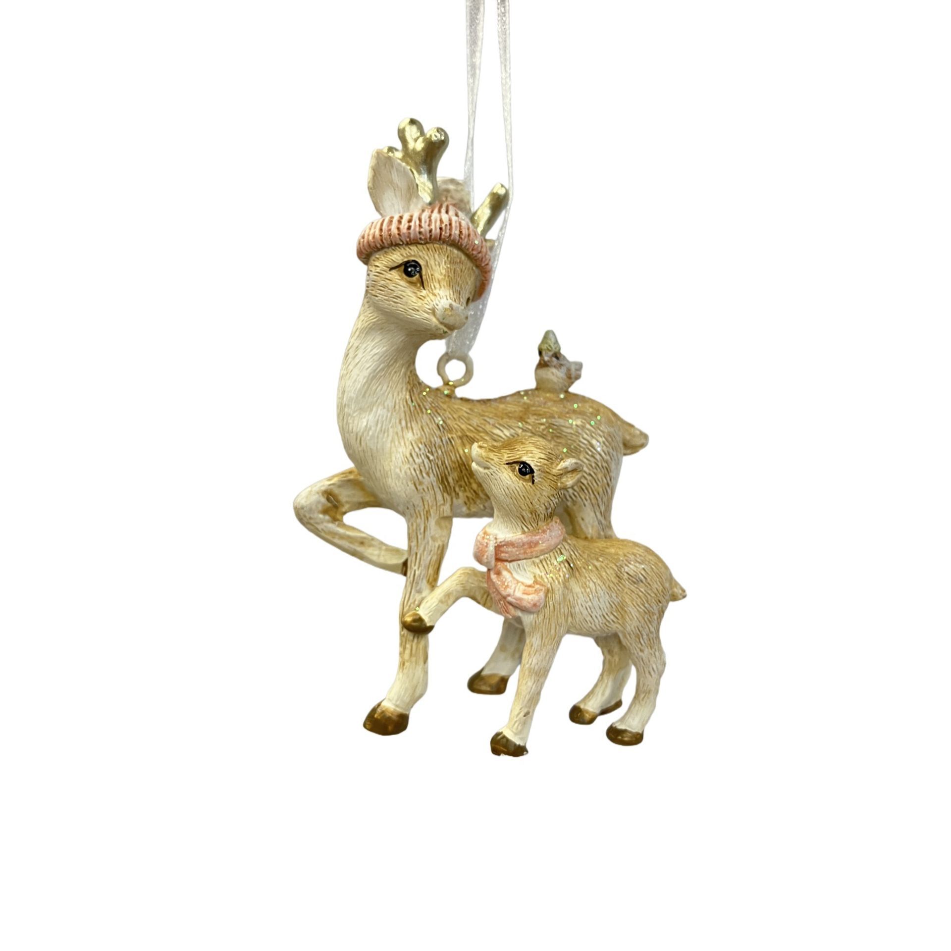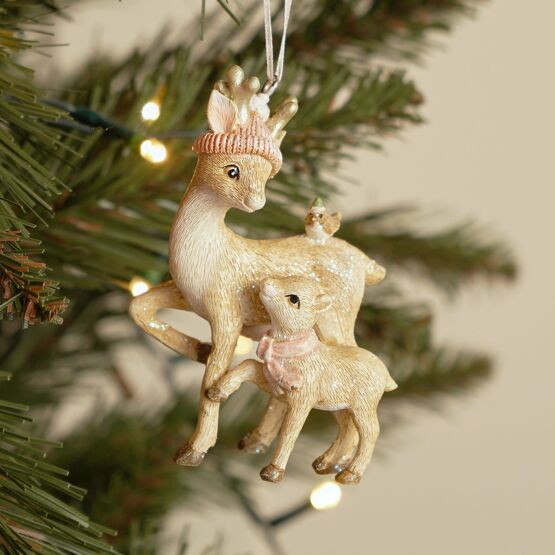Featuring two elegant deer in soft pink tones with metallic accents, this ornament offers a gentle nod to traditional festive themes. Designed for versatile use across trees, windows, or gifting ranges, it blends easily into coordinated seasonal displays.