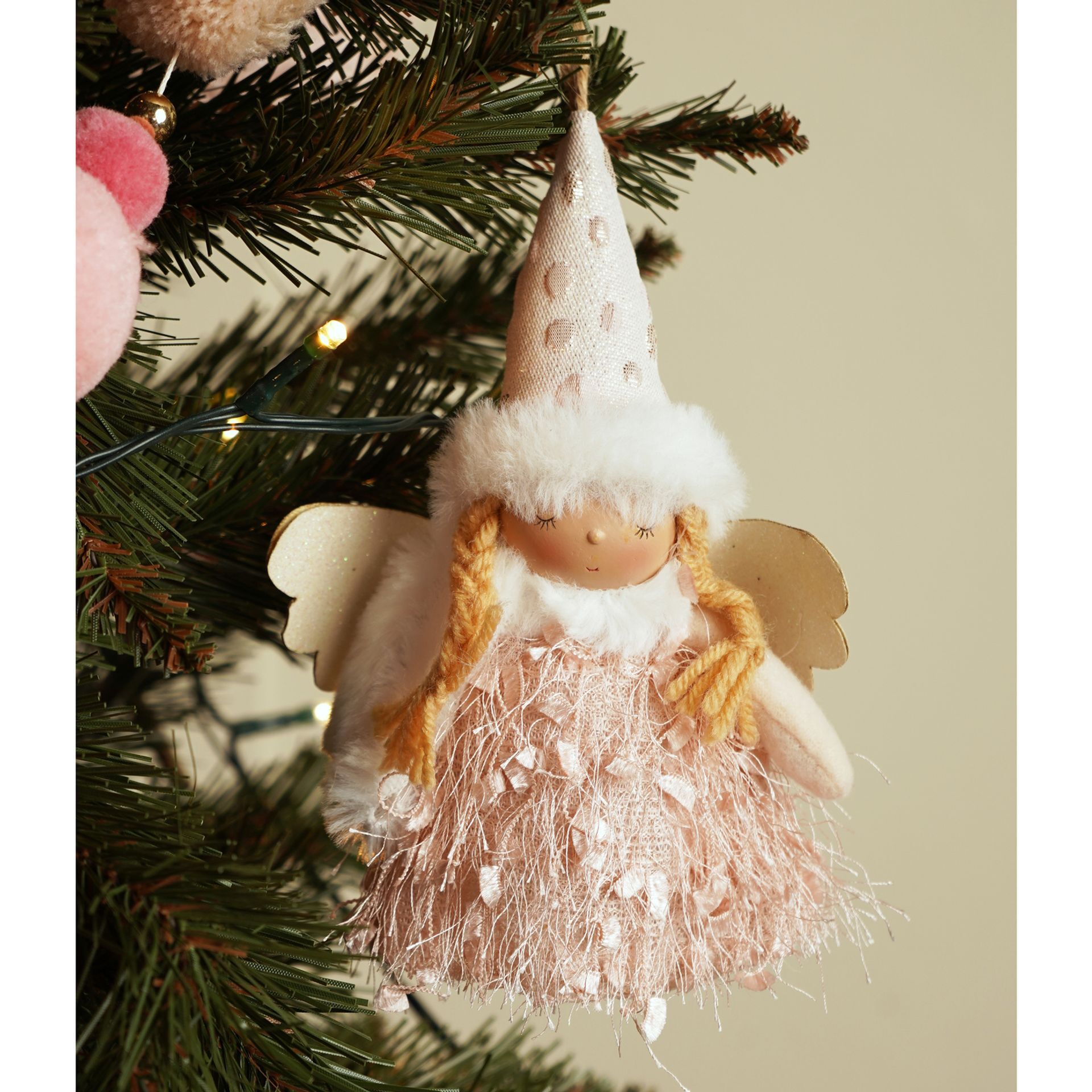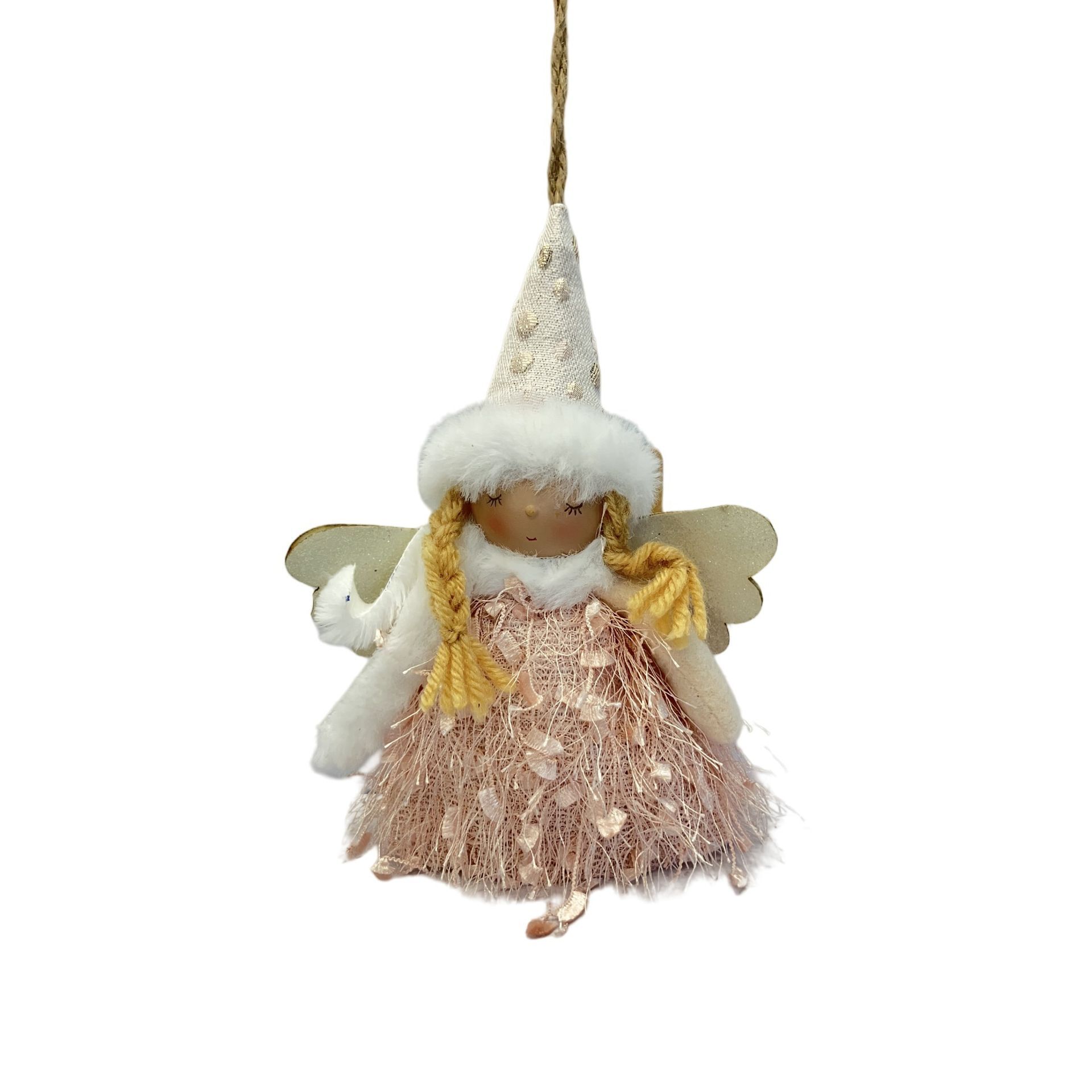 A soft angel figure with a white hat, golden wings, and a flowing pink dress with tassel detail captures understated elegance. Its pastel palette and lightweight design make it ideal for tree décor or delicate window arrangements.