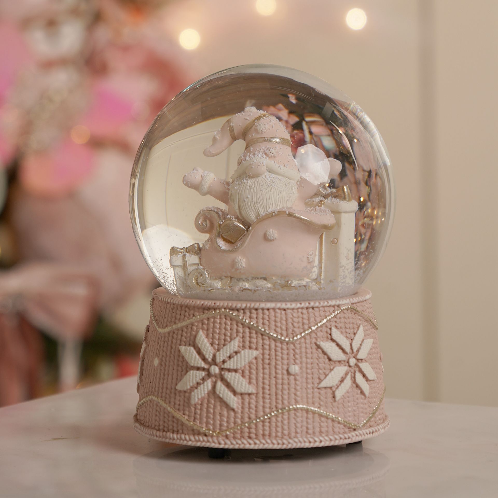 The Pink Santa in a Sleigh Waterball with Music combines traditional design with a soft, contemporary finish.