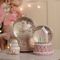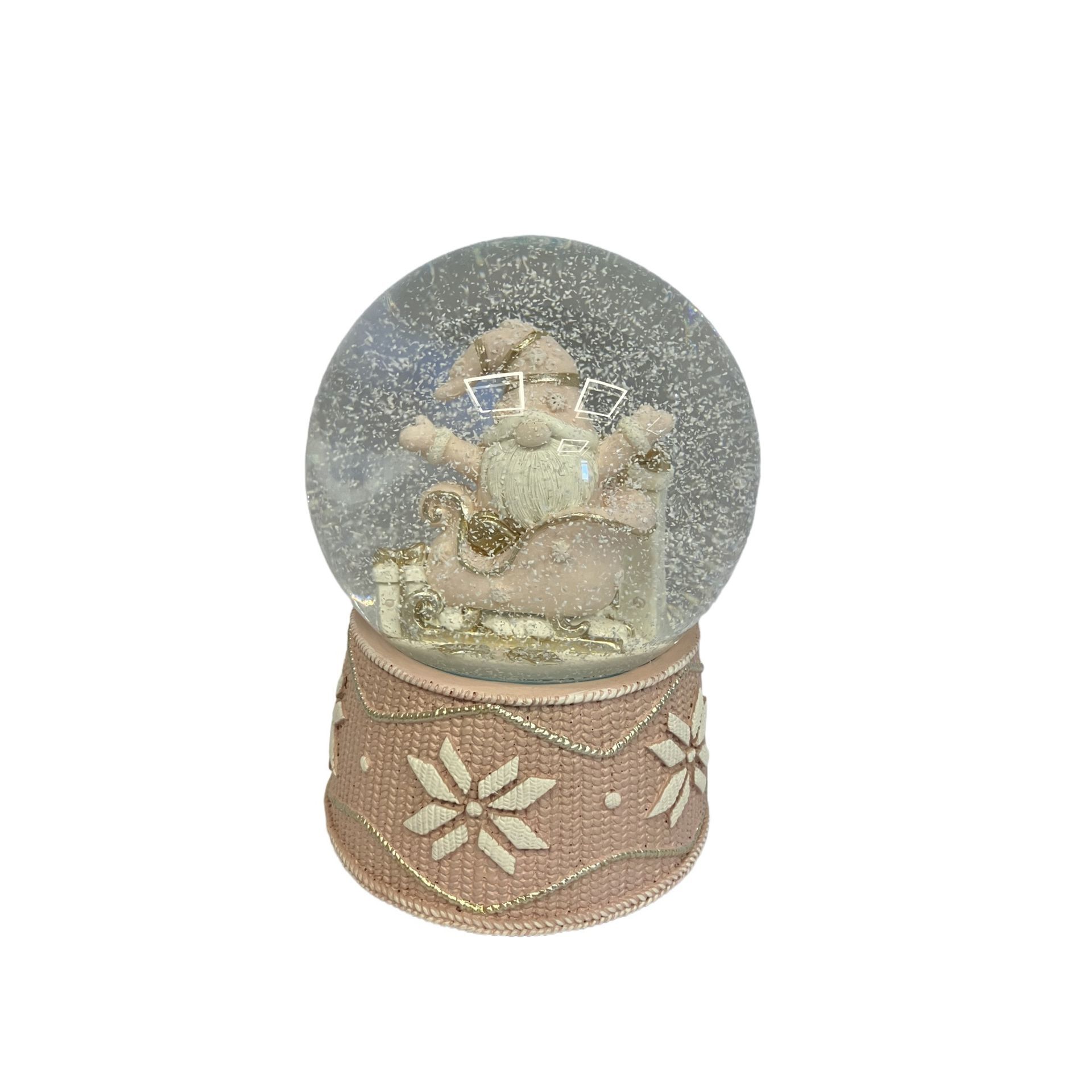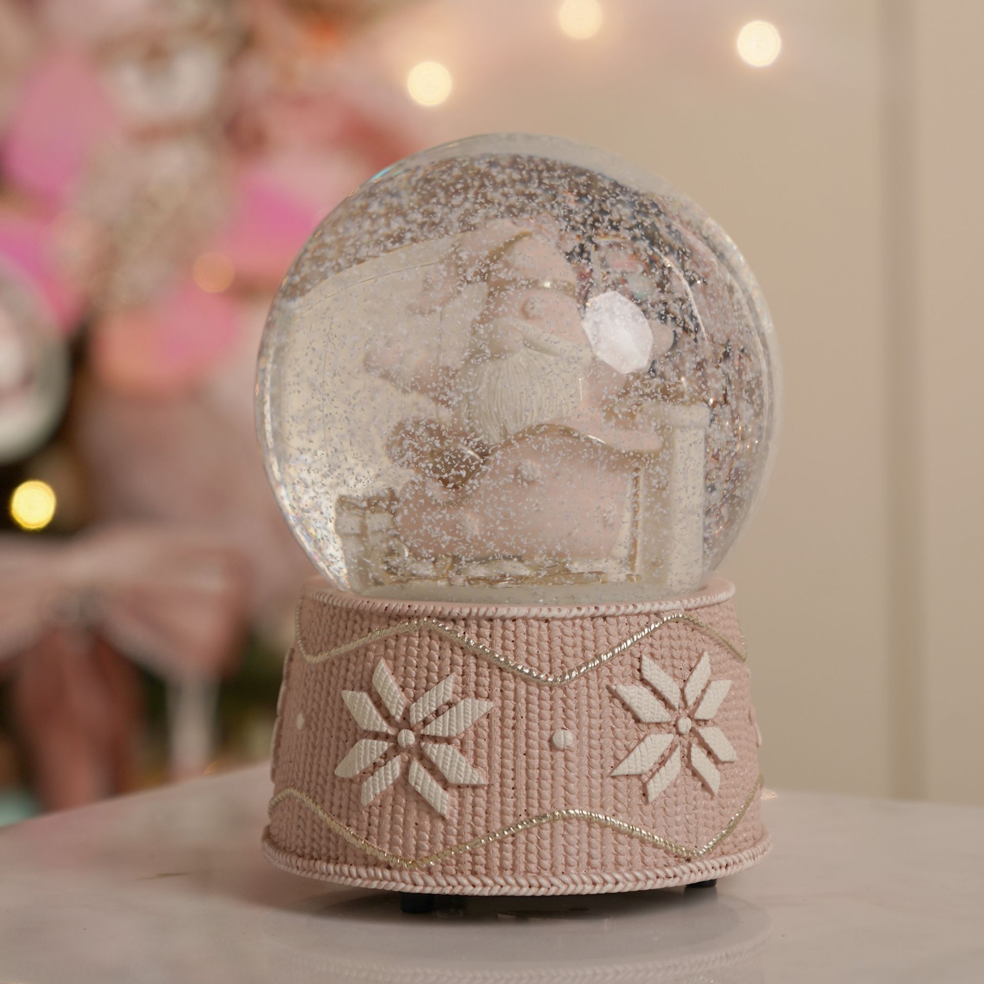 Inside the globe, a Santa figure sits within a snowy landscape surrounded by delicate detailing. Finished in pink and white tones, it blends classic Christmas charm with a modern pastel look suited to gifting or display.