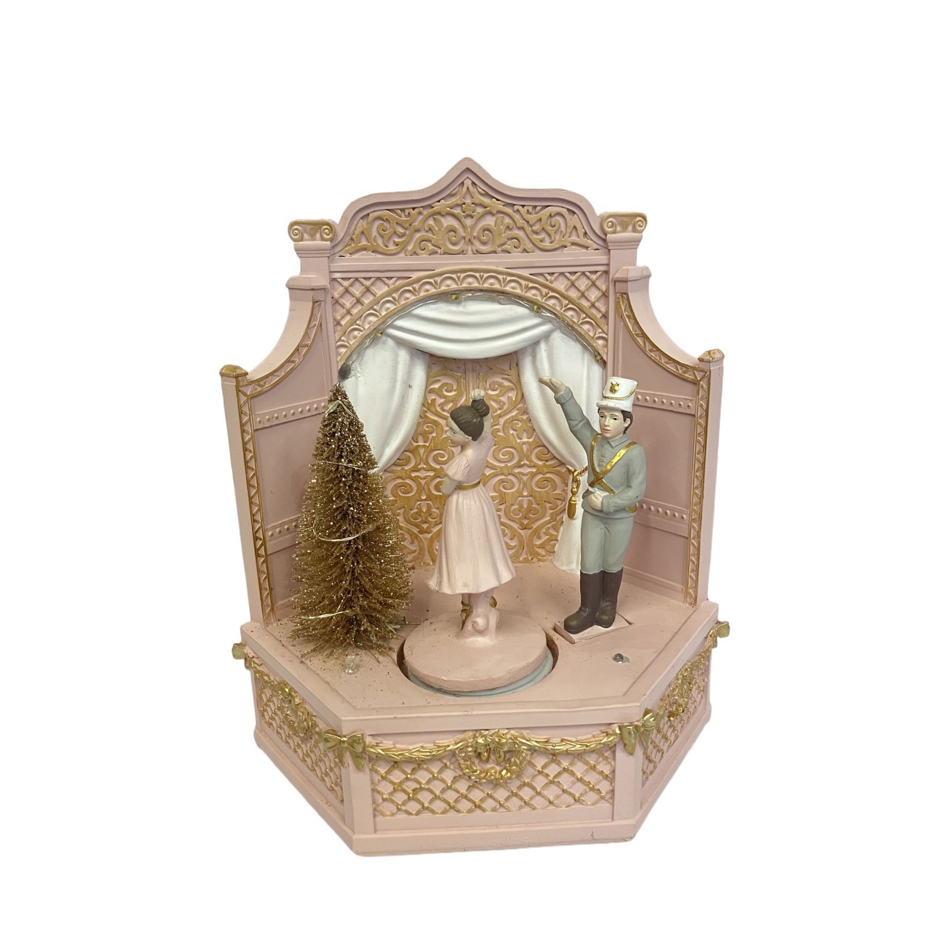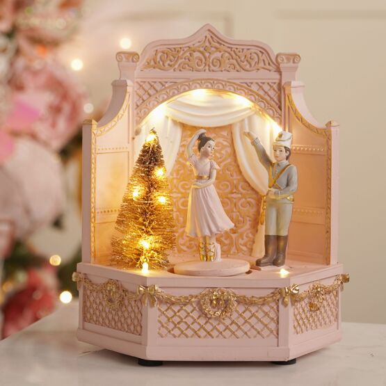 The Château Rosé Resin Ballerina Girl Ornament with LED and Music – 18 cm combines decorative detail with soft pastel tones. This intricate design depicts a couple in formal attire beside a Christmas tree, set within an ornate winter scene. Finished in blush and ivory with subtle metallic highlights and built-in LED lighting, it brings movement and light to seasonal ranges. Explore the Château Rosé collection for more elegant festive inspiration.