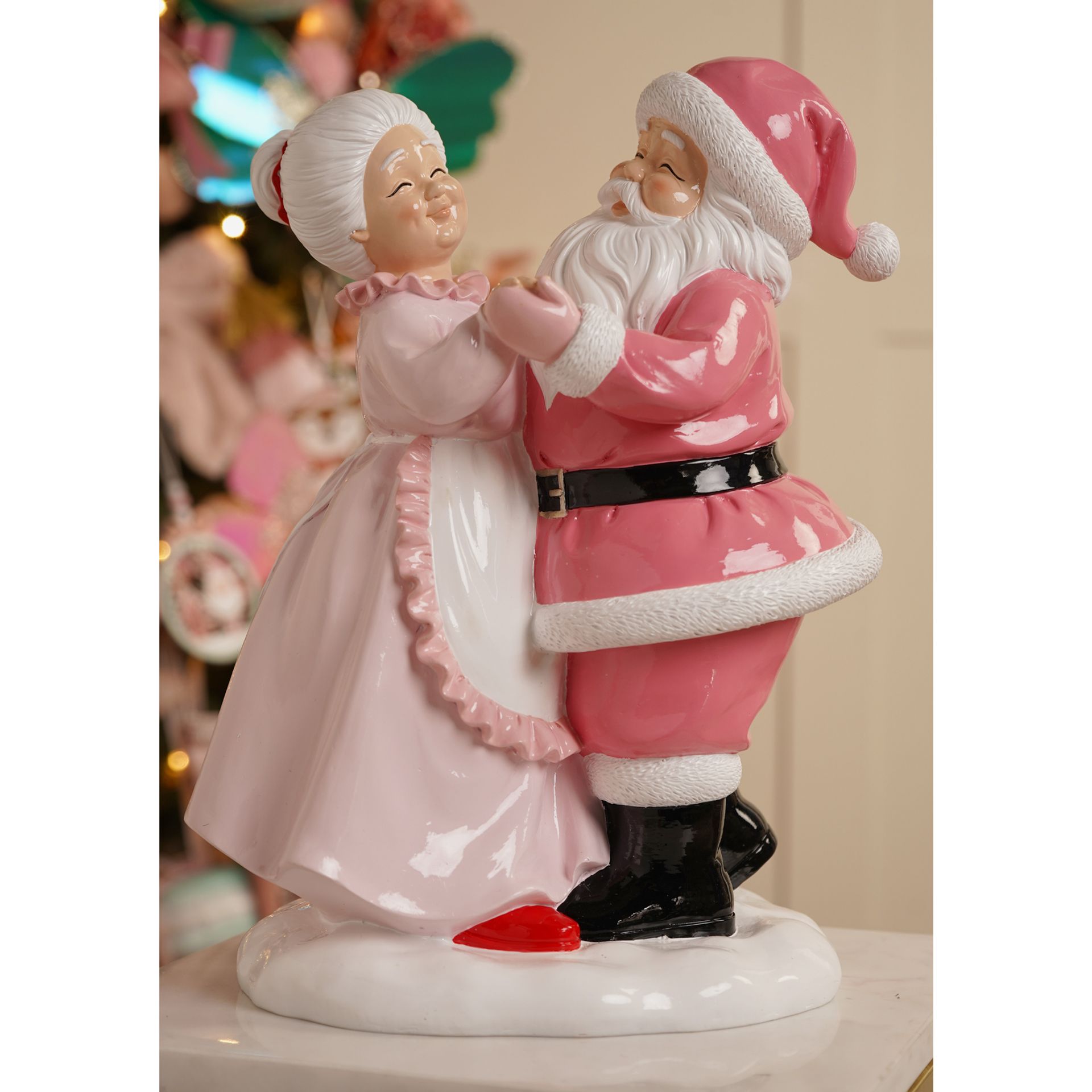 This joyful figurine captures Santa Claus dancing with Mrs Claus, both dressed in traditional holiday attire with playful pink accents.