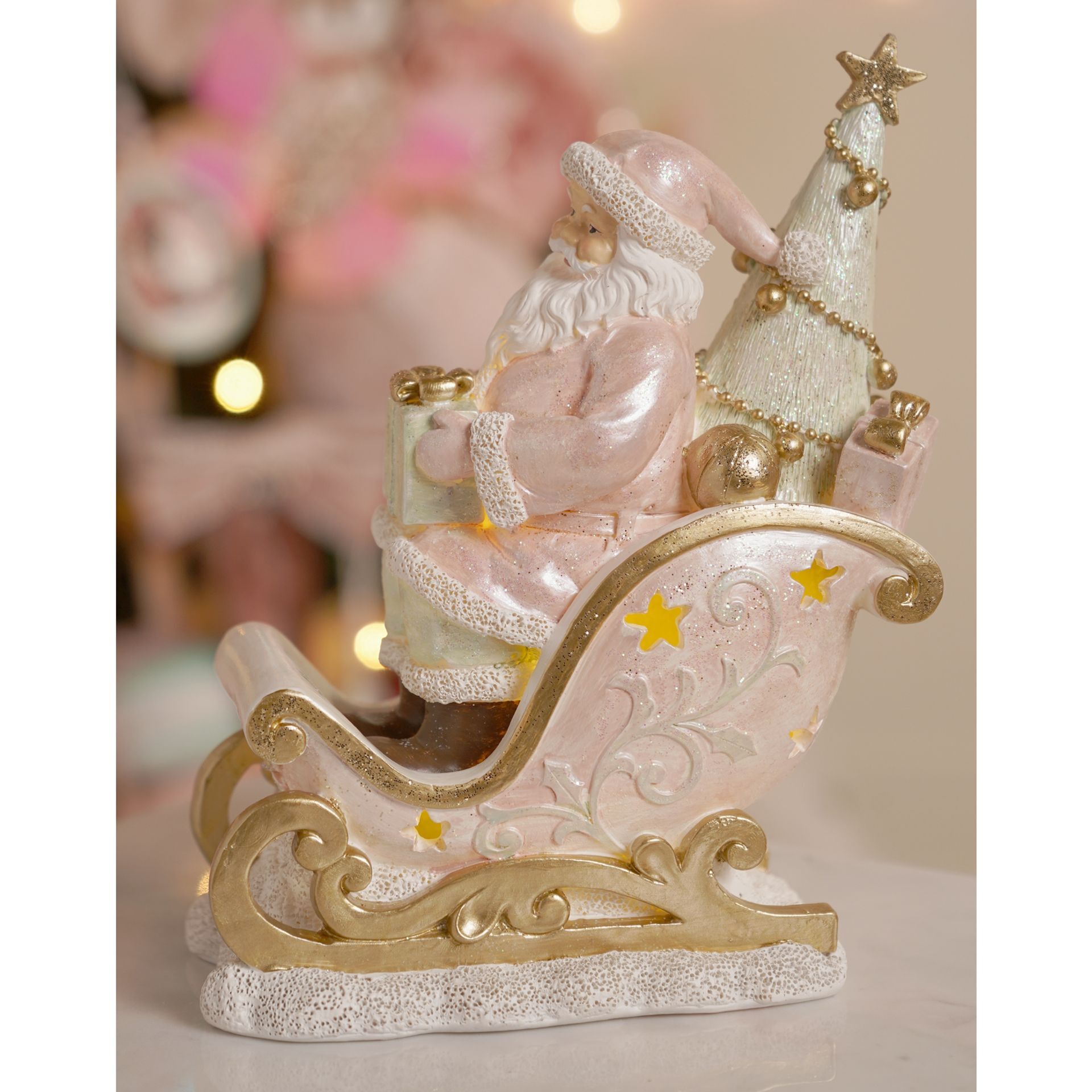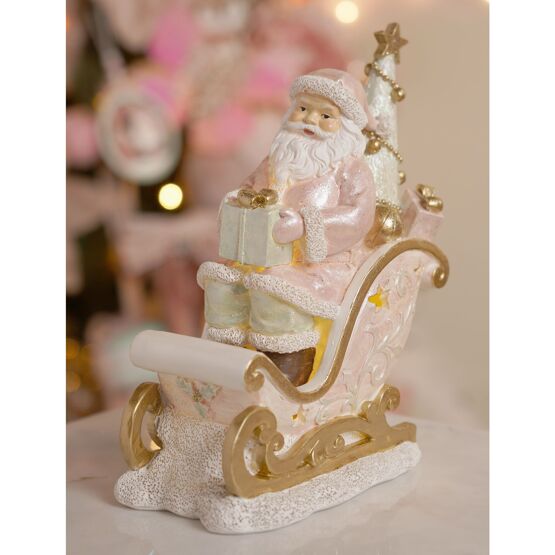 This whimsical figurine depicts a Santa Claus character sitting on a decorative sleigh, alongside other festive elements. Finished in soft pastel resin, it suits curated festive ranges or gifting displays.