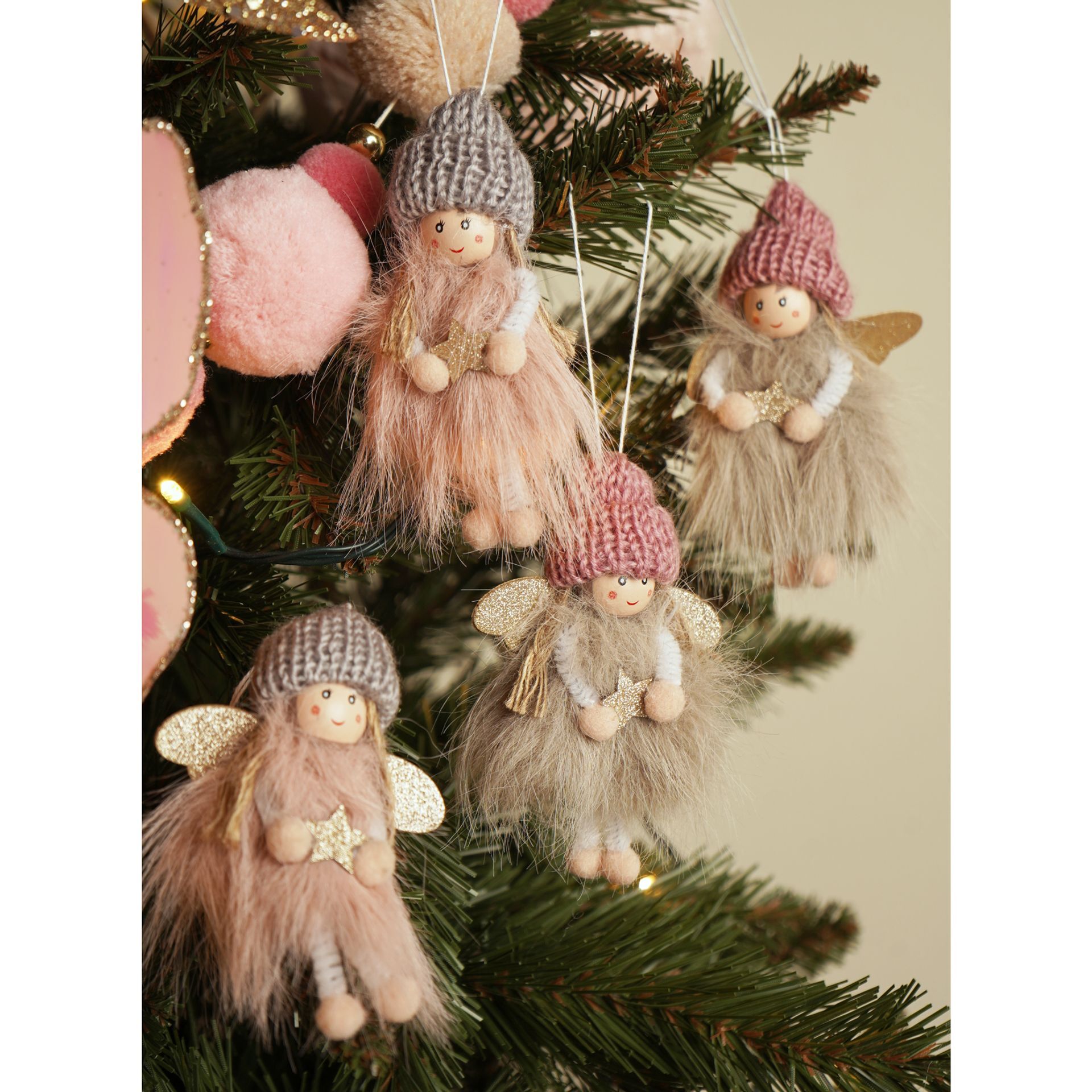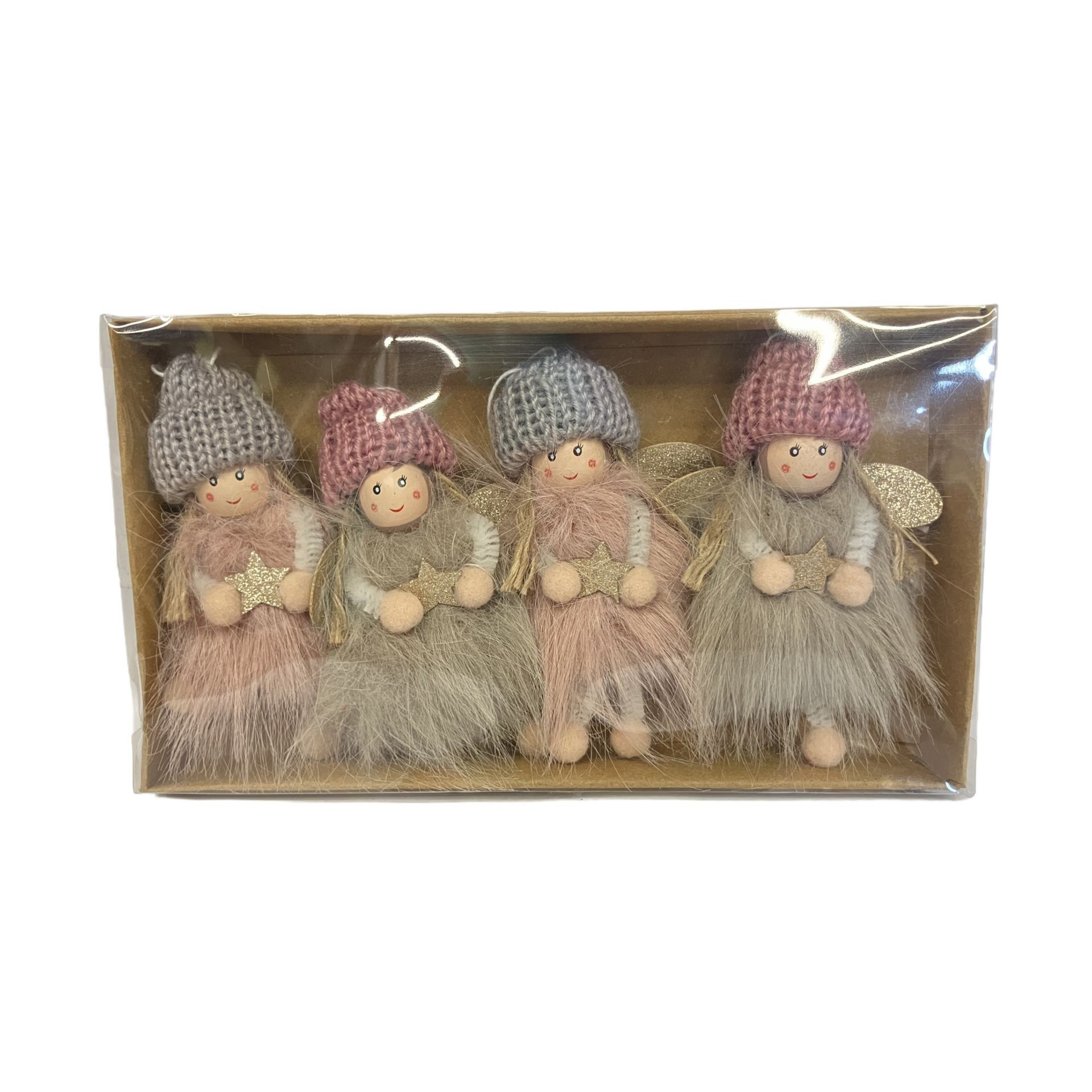 Each set includes four plush angels with fuzzy bodies and knitted hats in pink and grey tones, adding warmth and subtle contrast to Christmas styling. Designed for tree décor, mantelpieces, or window arrangements, they bring a coordinated, contemporary feel to seasonal ranges.