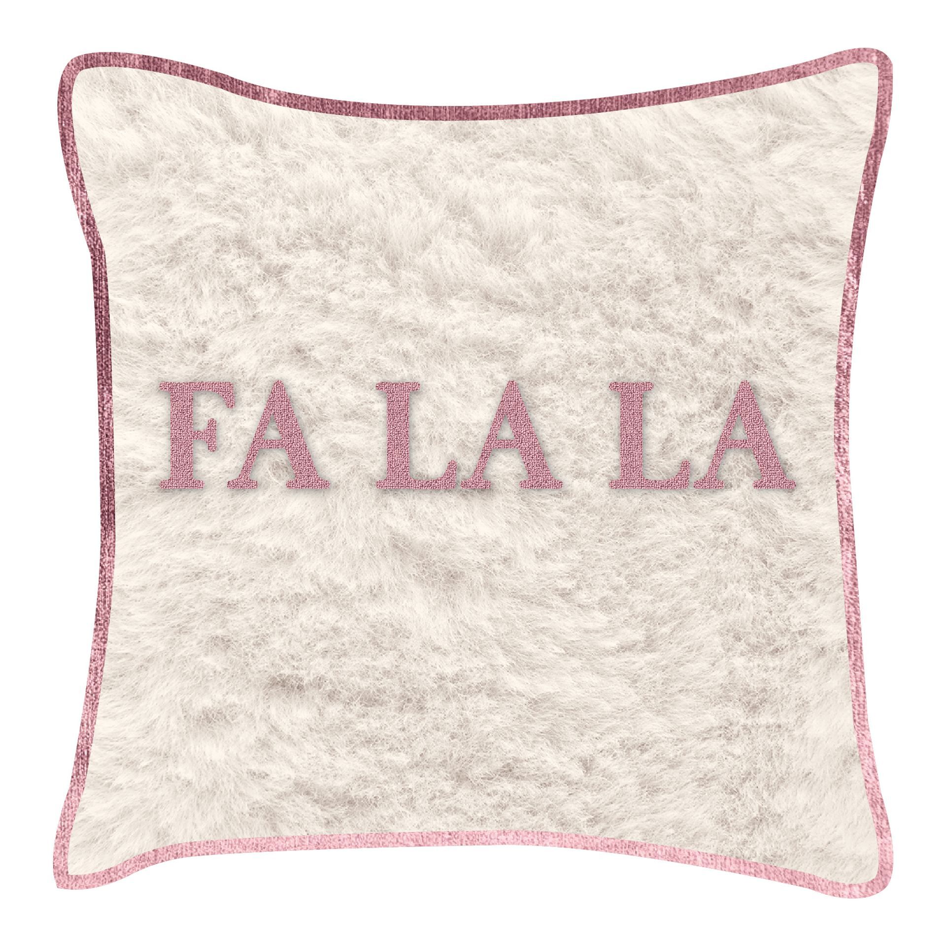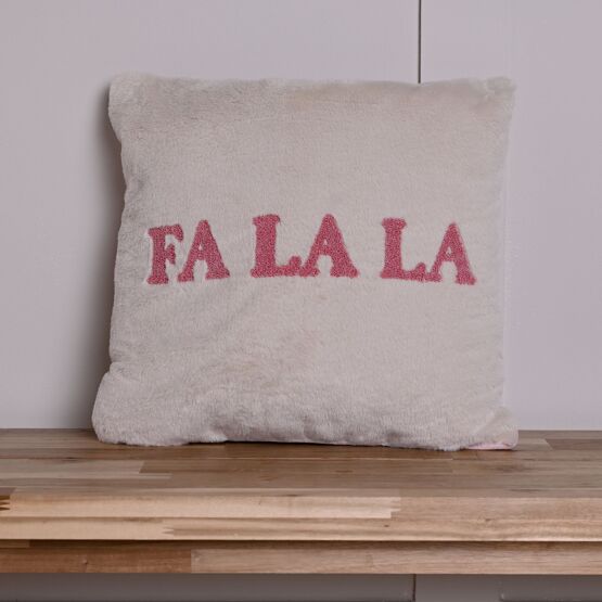 The white furry cushion with "Fa La La" embroidery, velvet back and pink piping s a playful accent for seasonal interiors. Size: 40x40cm. Pair with coordinating pieces from the Chateau Rose collection for a sugar-sweet seasonal display.