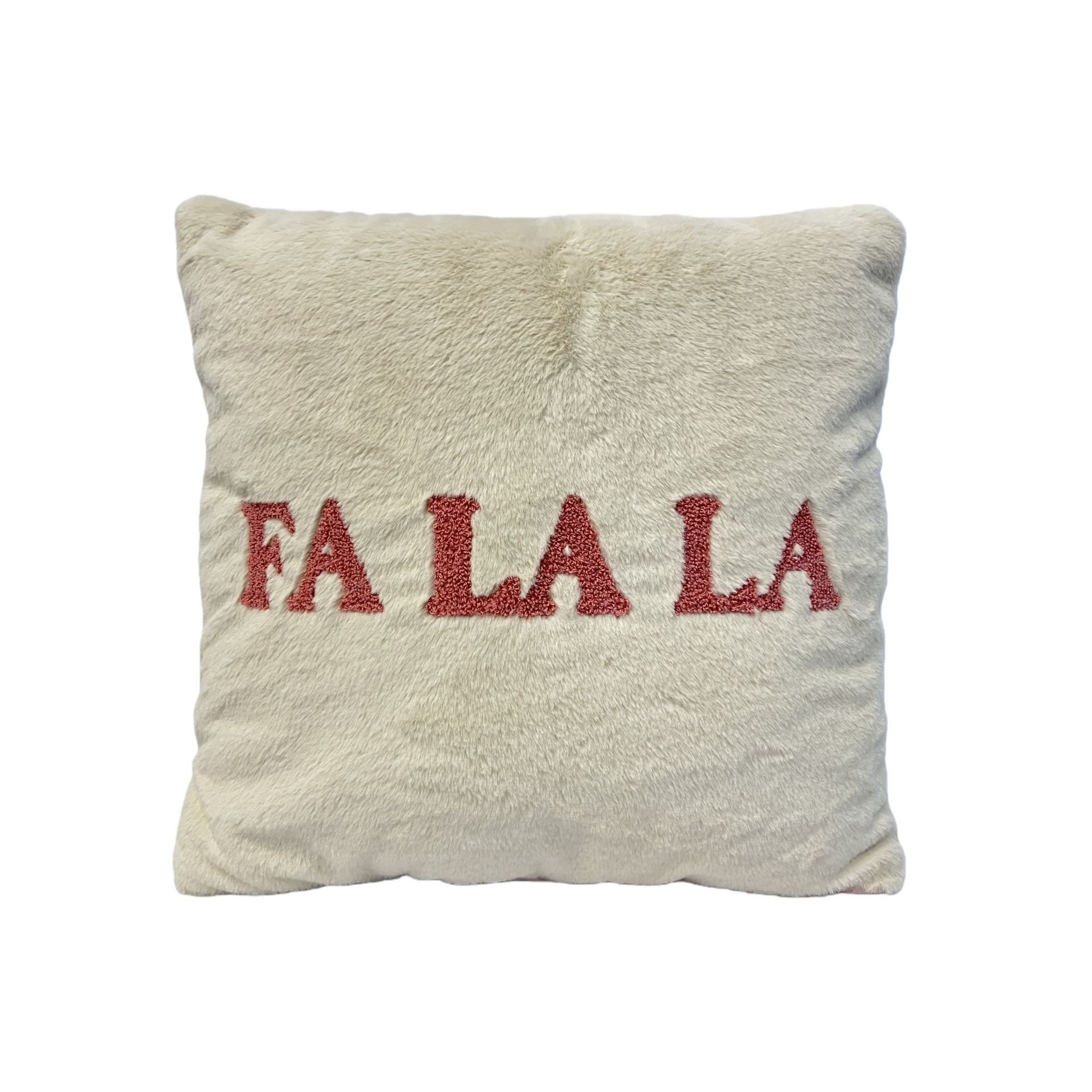 White Furry Cushion with Fa La La Embroidery, Velvet Back and Pink Piping 40x40cm