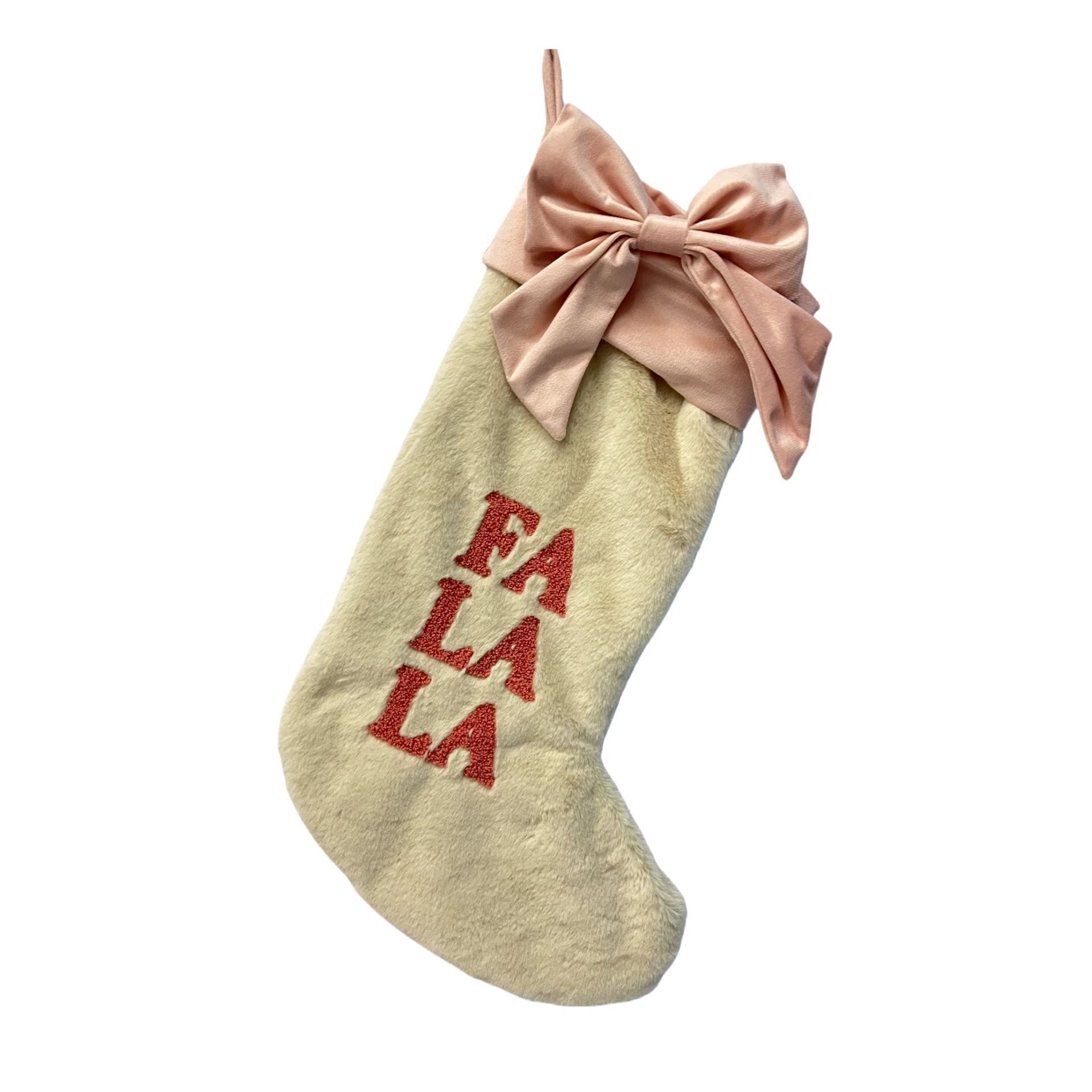 This white Christmas stocking features the embroidered word "FALALA", complemented by a plush light pink top and a large velvet bow for a sweet, contemporary finish. It is a charming addition to festive décor, blending playful nostalgia with refined detail. Pair with coordinating pieces from the Chateau Rose collection for a sugar-sweet seasonal display.