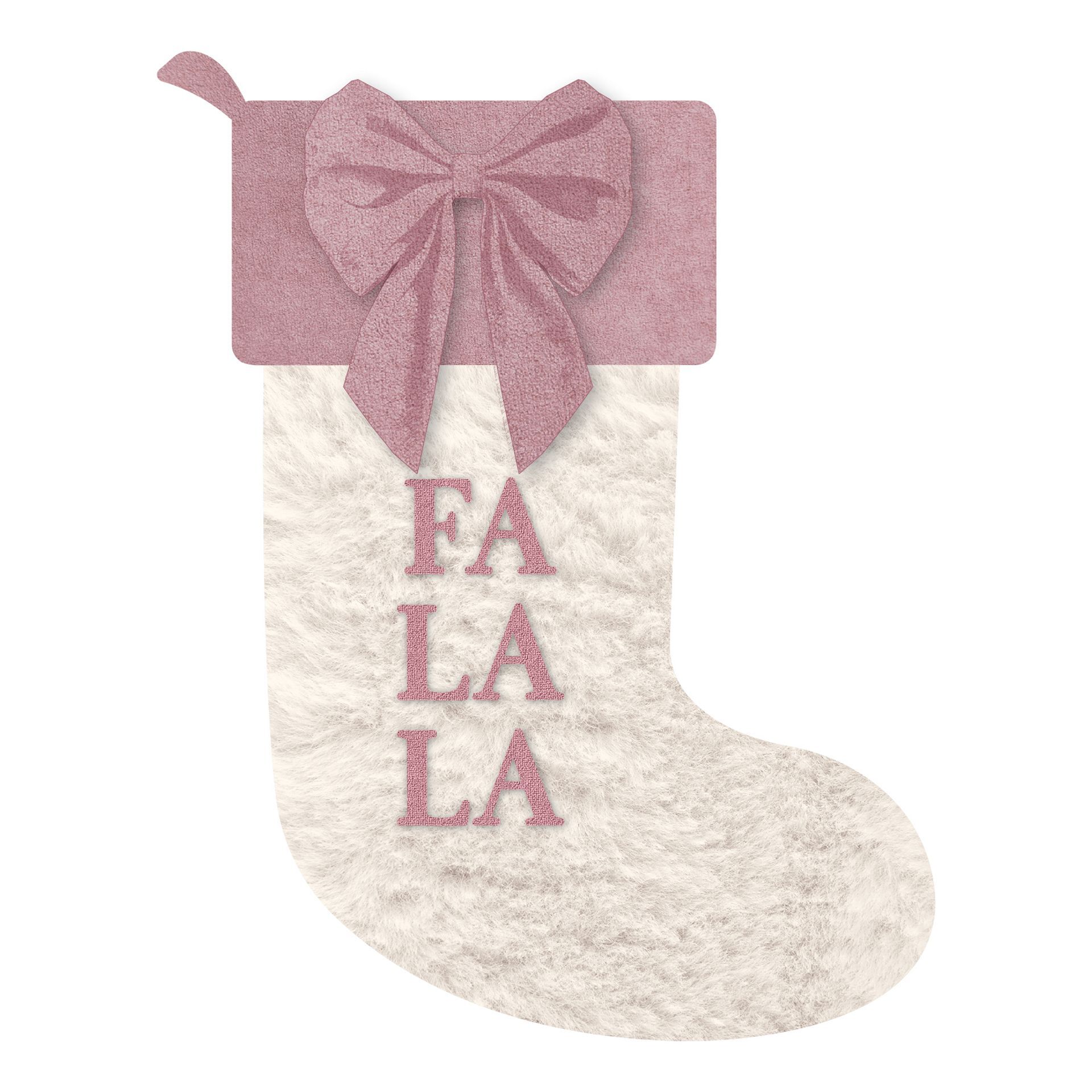 White Furry Stocking with Velvet Bow and Top and Pink Fa La La Embroidery