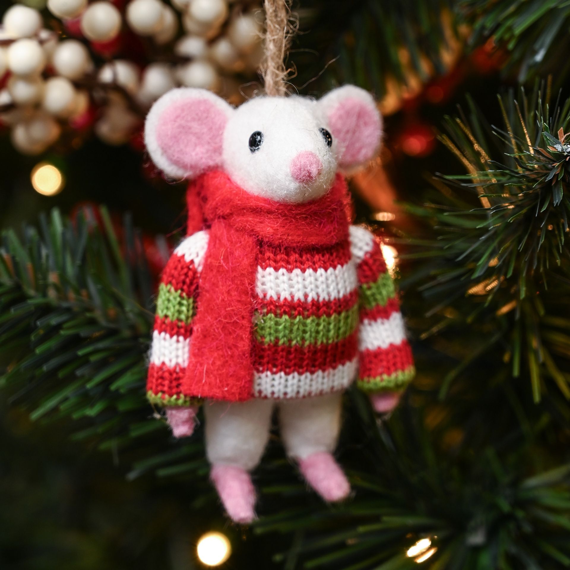 Add a splash of whimsy to your festive offerings with our Felt Mouse With Stripey Jumper. This delightful figure, draped in a cheerful red and green sweater, is sure to bring joy and warmth to any tree it graces.