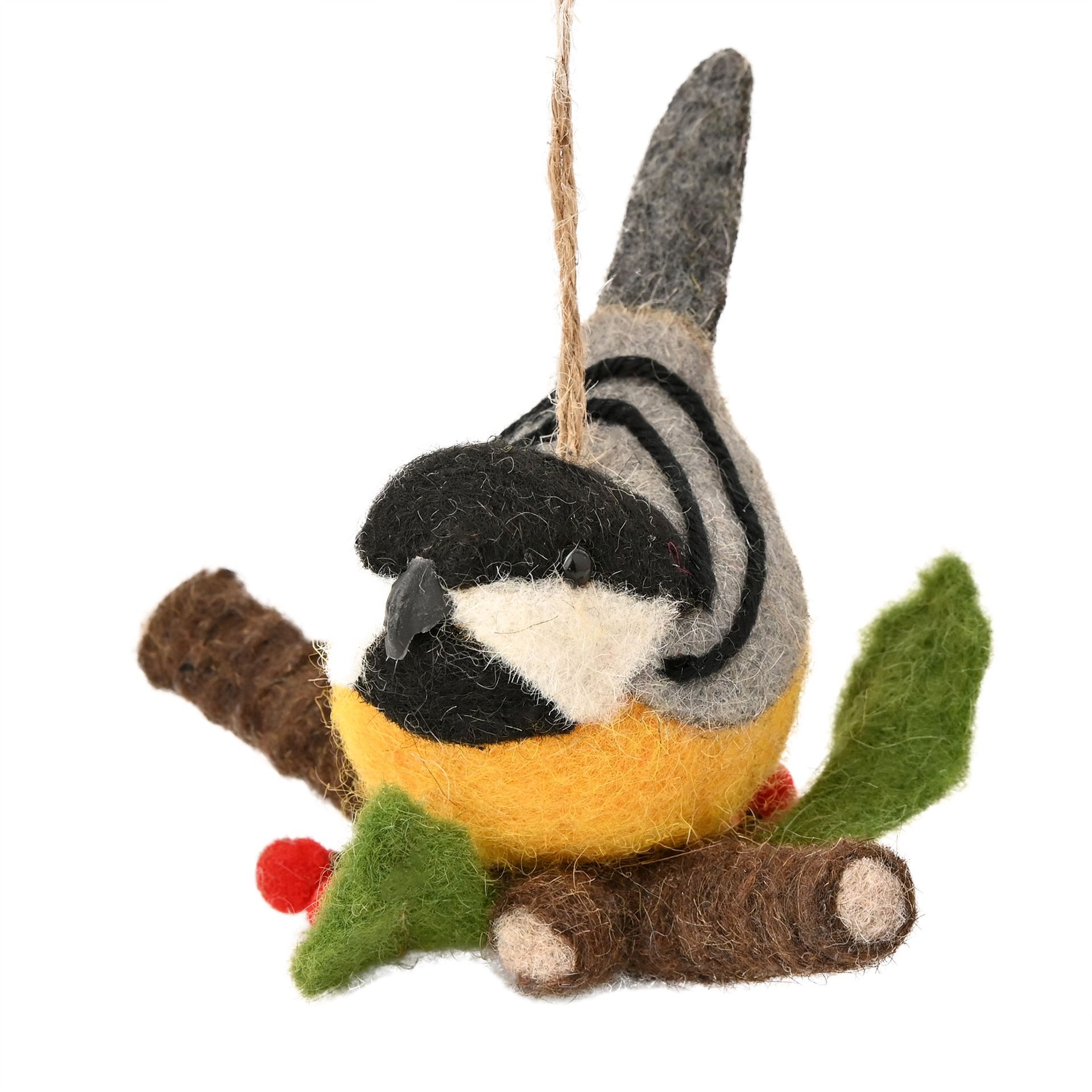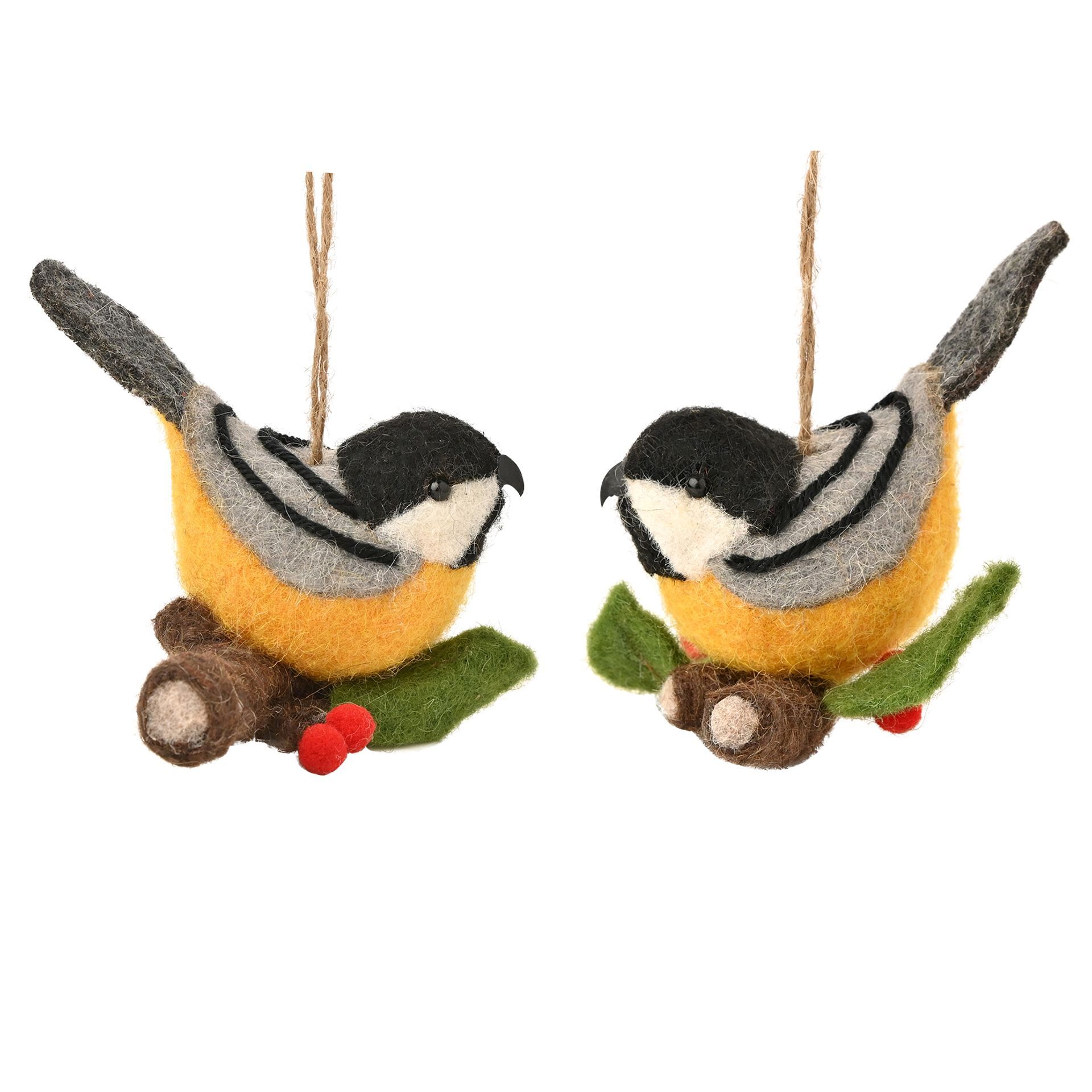 These plush felt birds, perched on a branch adorned with green leaves and vibrant red berries, are ready to bring a burst of countryside charm to any home.