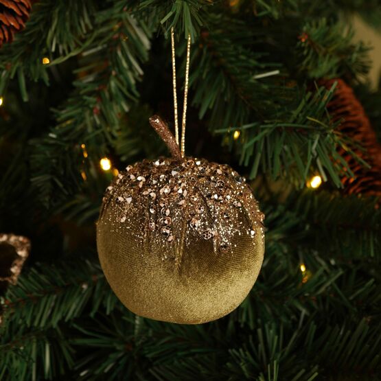 A green, textured ornament is crafted with plush velvet and subtle glitter, creating a gentle shimmer and tactile finish. The apple form is softly rounded, offering a modern take on nature-inspired design.