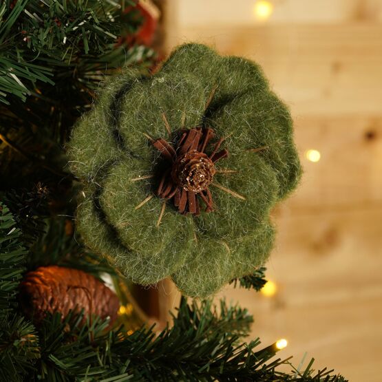 The Faux Fur and Felt Green Poppy in Natural Style with Clip is a botanical accent for seasonal decor. This green flower features a pinecone-like centre, crafted from faux fur and felt. The attached clip allows for easy placement on wreaths, garlands, or tree branches. Complete the look with other woodland-inspired accents from the Forest Fable collection.