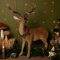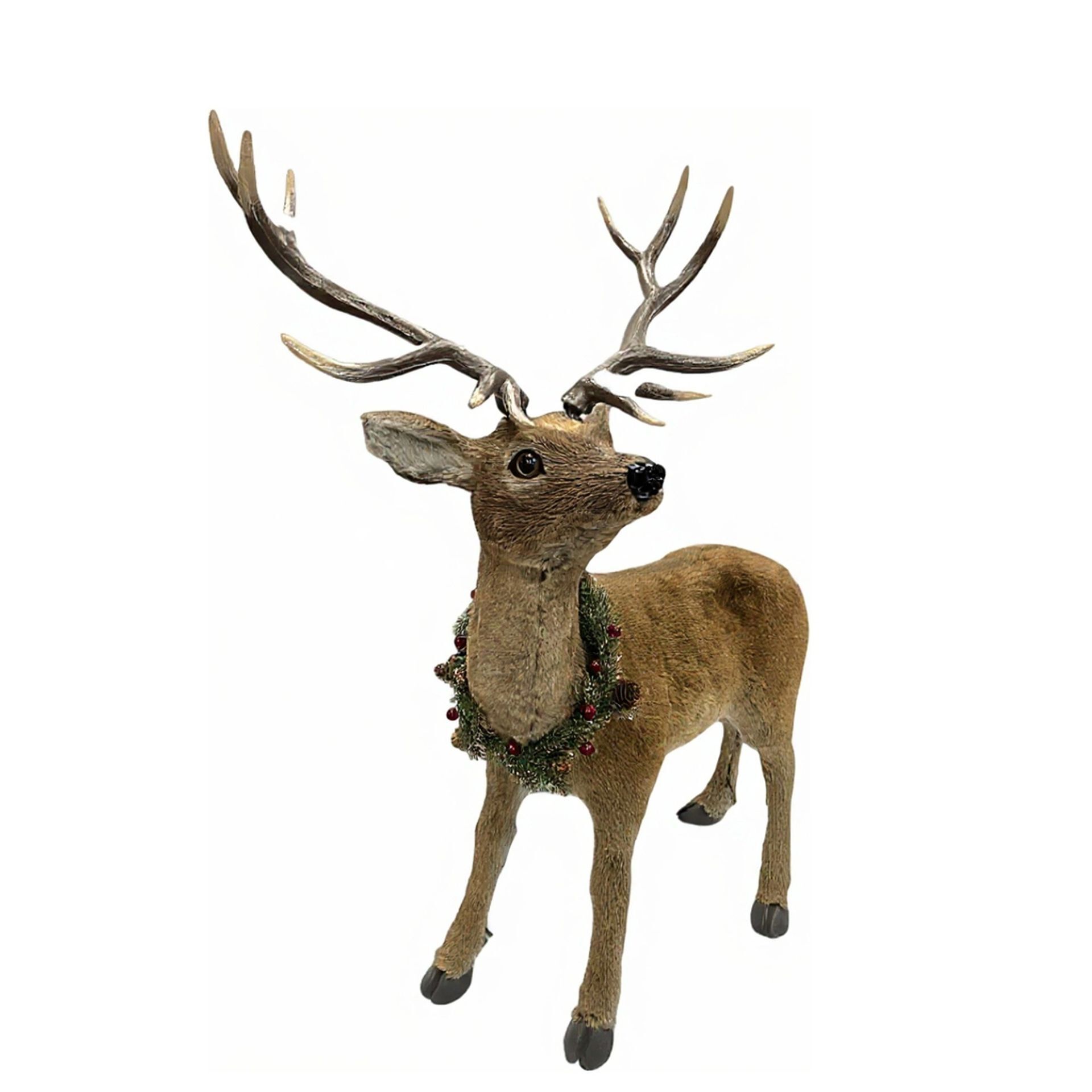 A realistic-looking deer figurine with large antlers is finished in brown faux fur, capturing the gentle character of forest wildlife.