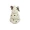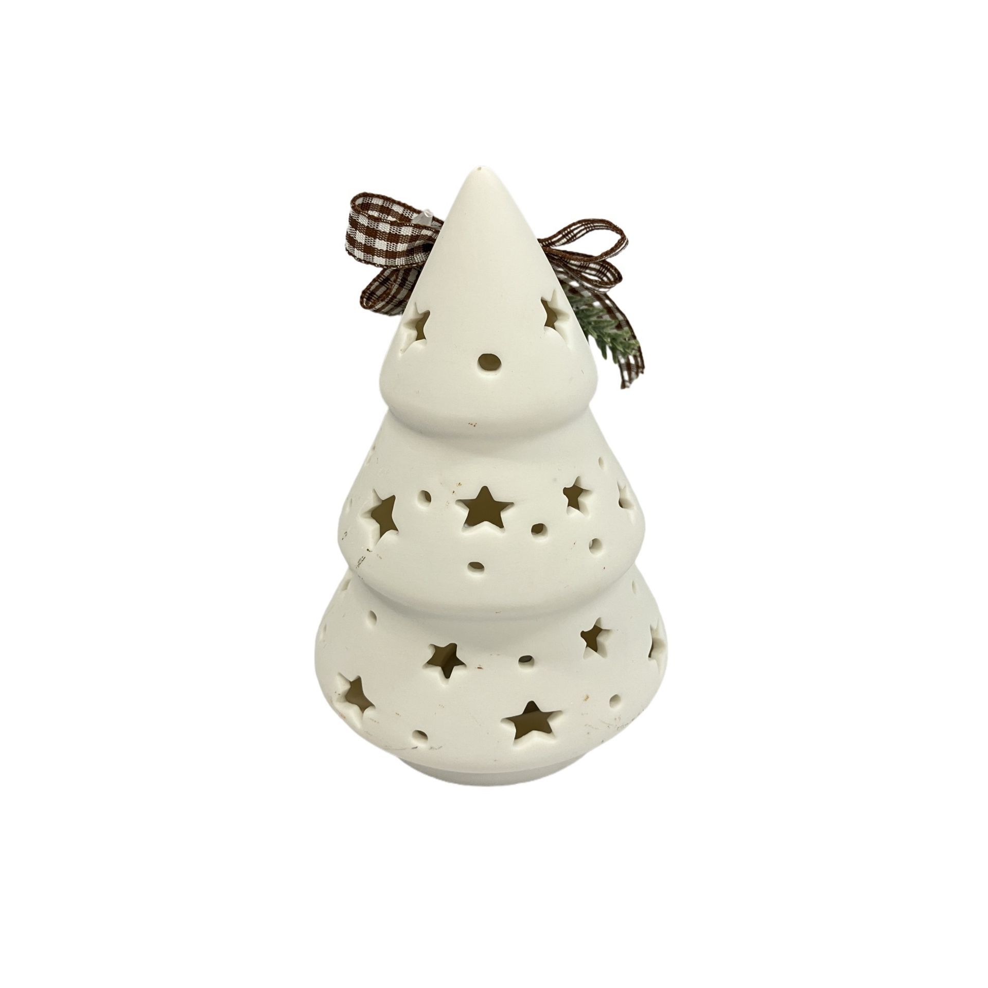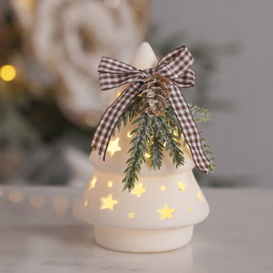 A white ceramic Christmas tree-shaped ornament with star-shaped cutouts and a brown and white checkered ribbon bow on top, softly illuminated by integrated LED lights.
