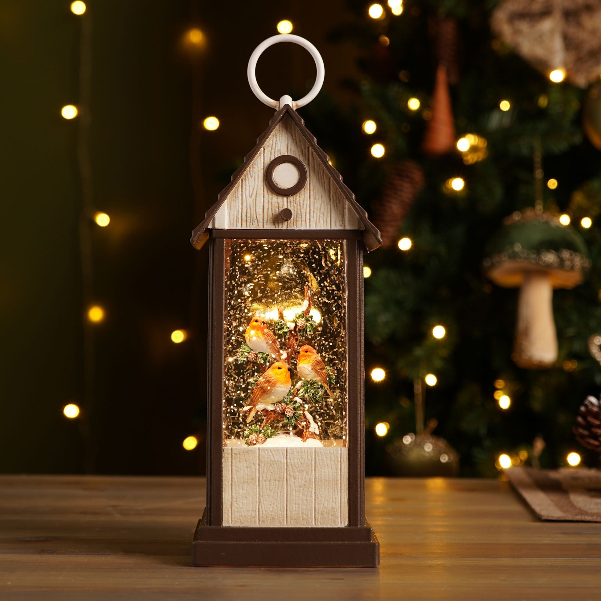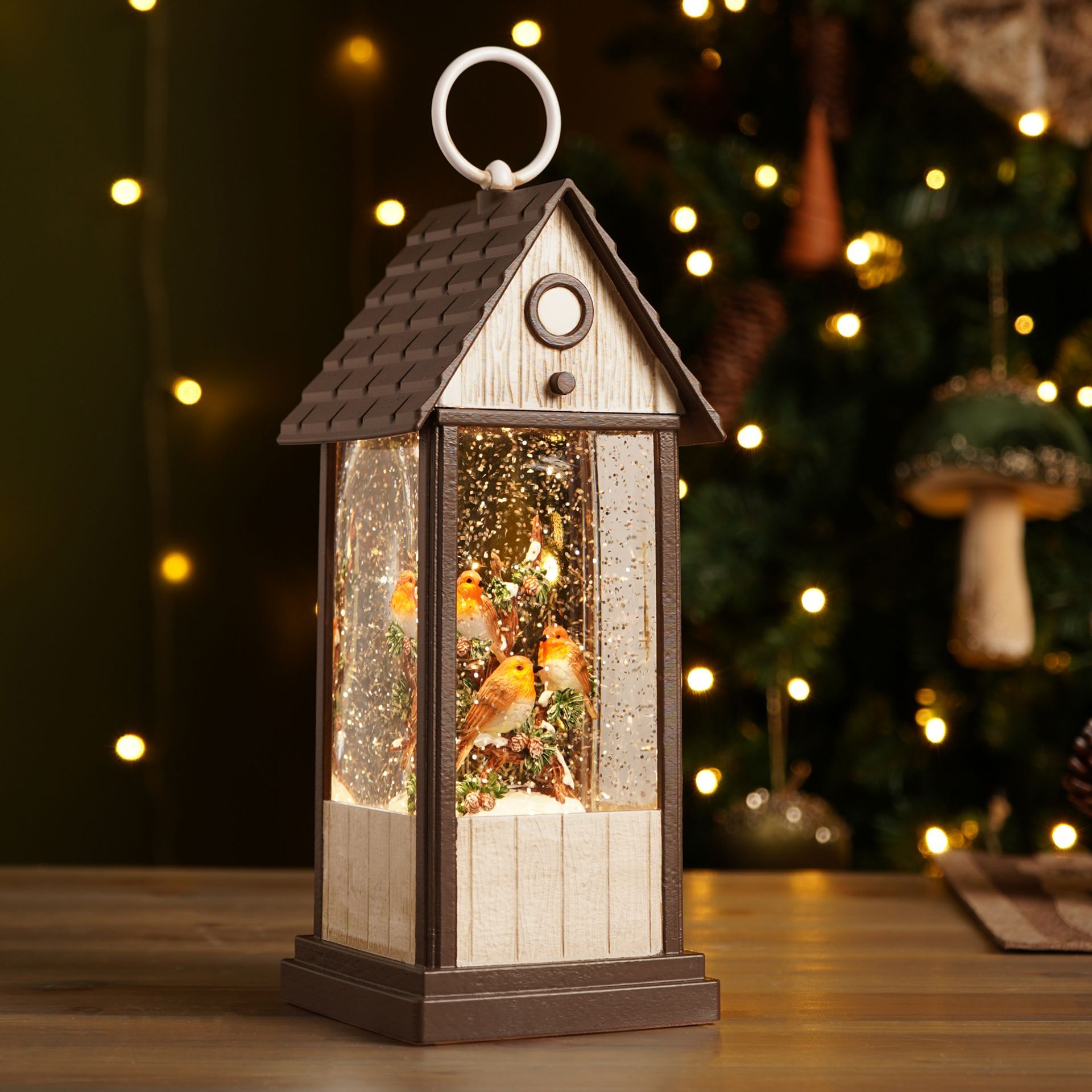 A wooden birdhouse with a glass panel displaying a floral arrangement, this lantern blends warm neutrals and earthy tones with organic textures. Gentle illumination and swirling water enhance its inviting, nature-inspired character.