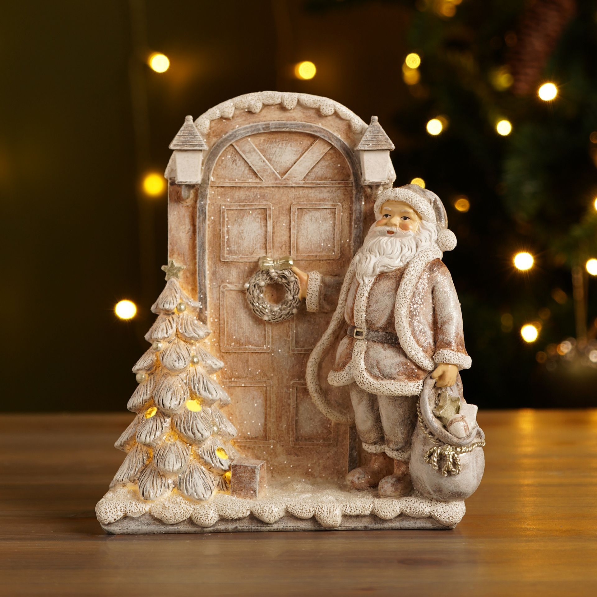 LED Resin Natural Effect Santa at Door with Glitter Sparkle Figurine 2 Batteries Included - 19cm