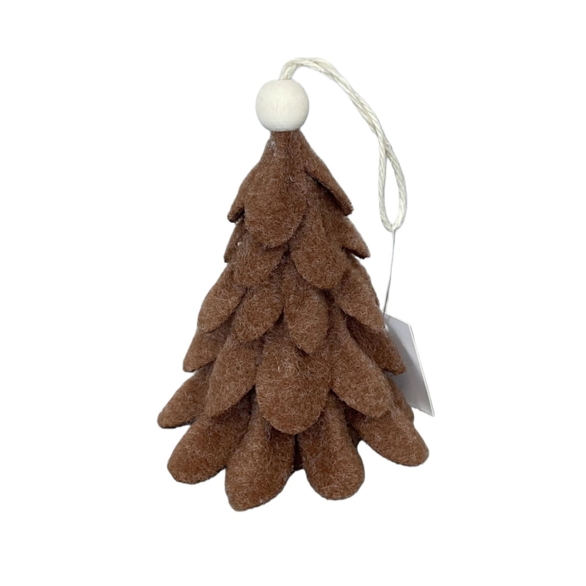 A brown, felt-like Christmas tree ornament is topped with a crisp white ball, offering a playful nod to classic holiday motifs. Its soft texture and simple silhouette evoke the comforting spirit of a natural woodland.