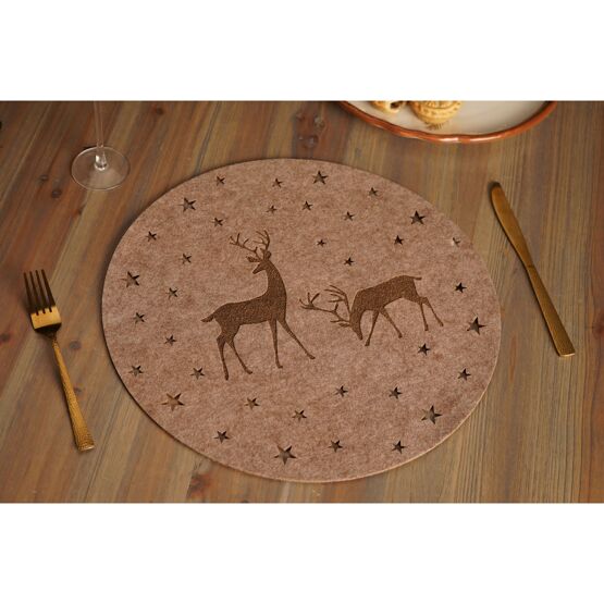 Featuring two deer silhouettes standing in a snowy, starry landscape, this round felt placemat is presented in warm neutrals and earthy tones. The soft, organic texture adds a gentle, woodland character to seasonal settings.