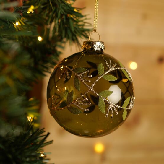 The Green Glass Bauble with Gold and Green Leaf Pattern – 8cm is a decorative glass ornament with a natural design.