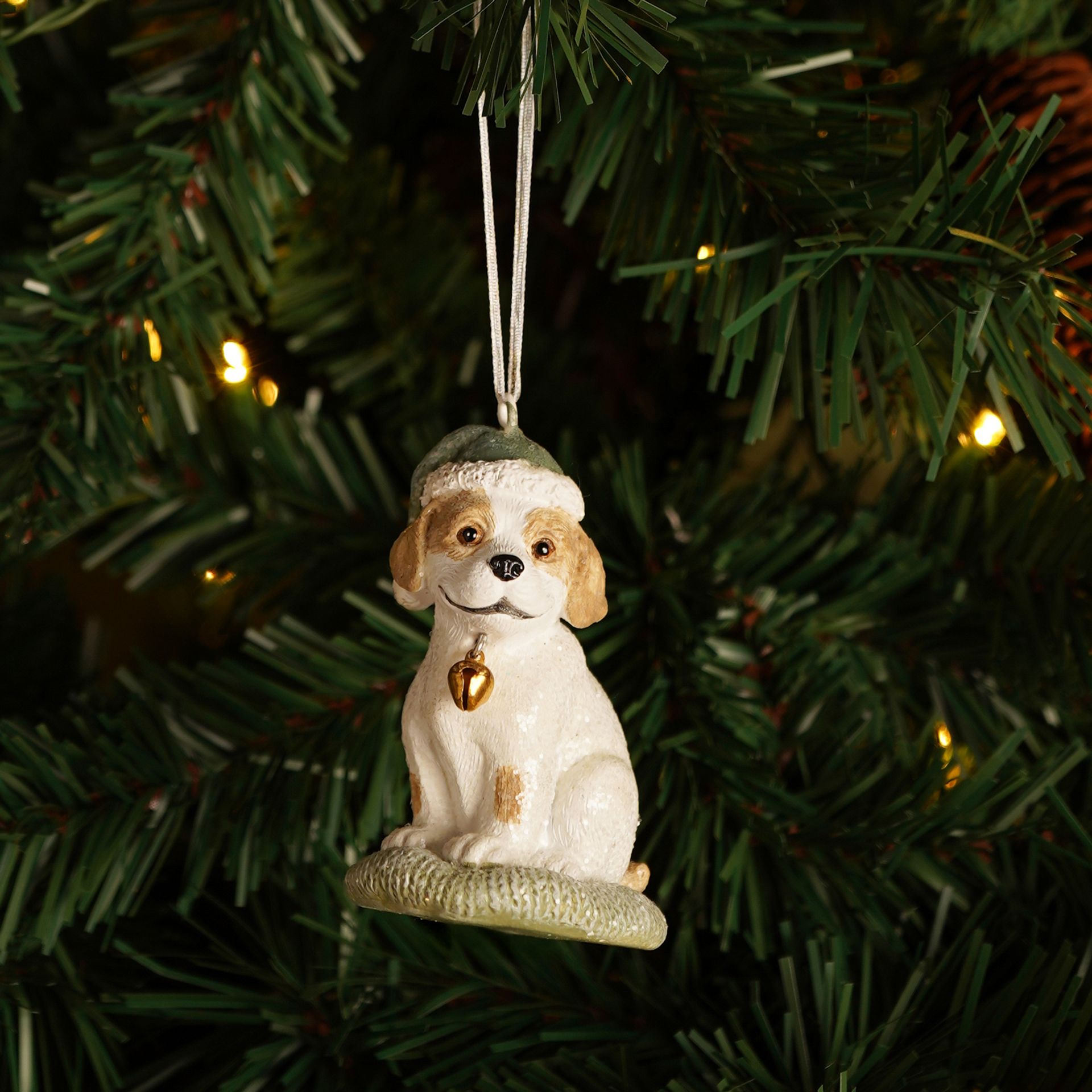The MULTI 6 Resin Natural Effect Hanging Ornament with Glitter Sparkle - Dog introduces a playful character to tree displays.