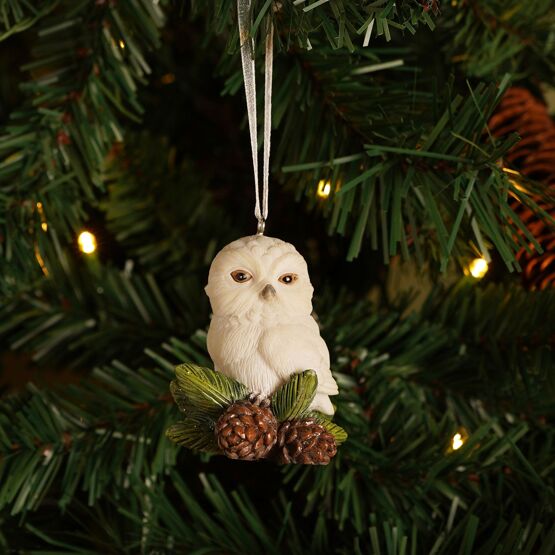 A white, fluffy owl figurine is perched on a pine cone and leaves, crafted in resin with subtle glitter detailing for a gentle festive shimmer.