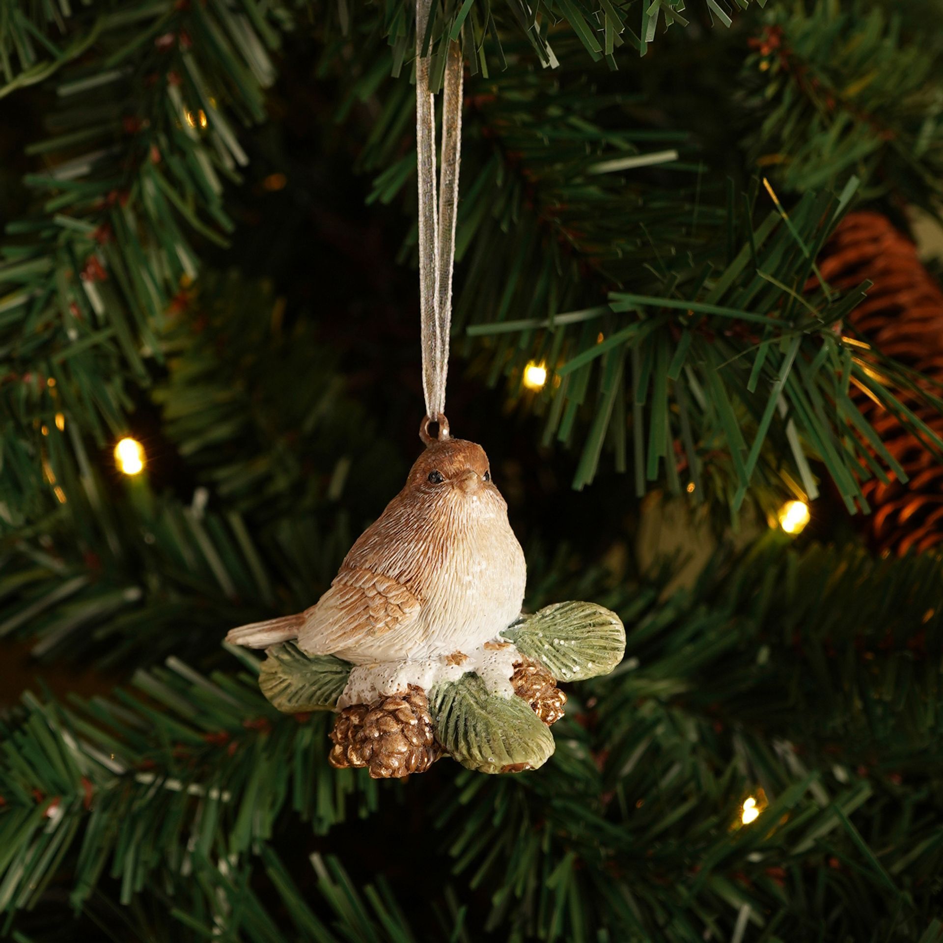 A detailed ornament depicting a small bird perched on a branch with pine cones, finished in warm neutral tones and subtle glitter for a gentle festive shimmer.