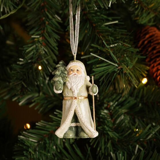 The Resin Natural Effect Hanging Ornament with Glitter Sparkle - Santa adds festive charm inspired by woodland beauty. Featuring Santa in a green and white robe holding an evergreen tree, it's adorned with subtle glitter sparkle for seasonal shine. Made of resin with a natural effect, it offers earthy tones and organic texture. Pair it with other woodland-inspired pieces from the Forest Fable collection.
