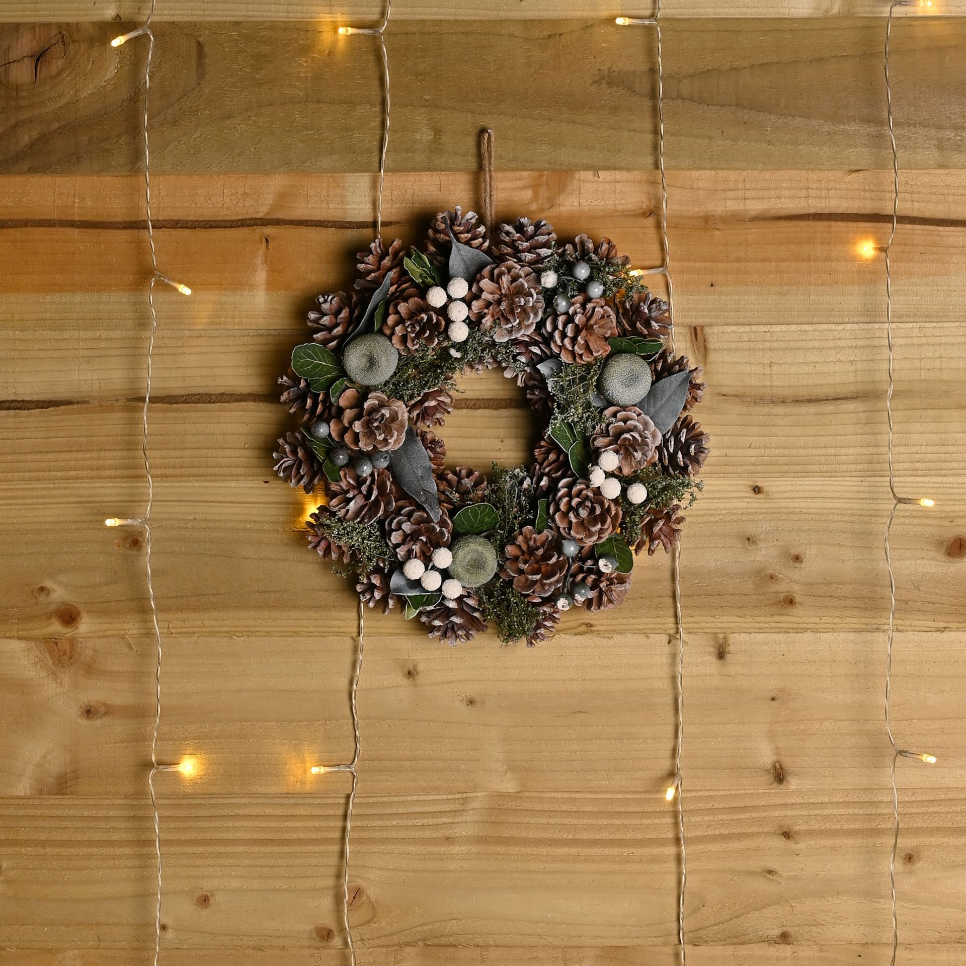 Natural Pinecone Wreath with Green Leaves and Berries in Brown Showbox 30cm