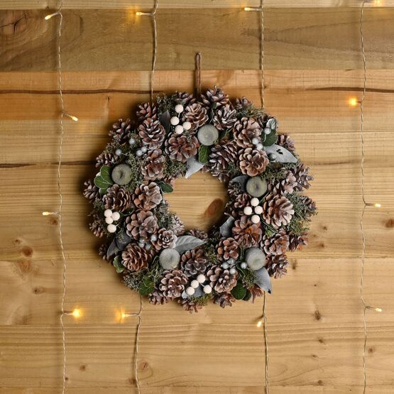 Natural Pinecone Wreath with Green Leaves and Berries in Brown Showbox 38cm