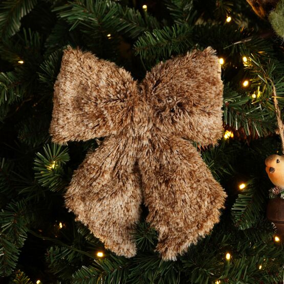 A large, fluffy, beige-coloured bow-shaped piece is crafted in soft faux fur, brings warmth and texture.. The attached clip allows for effortless placement on wreaths, garlands, or tree branches.