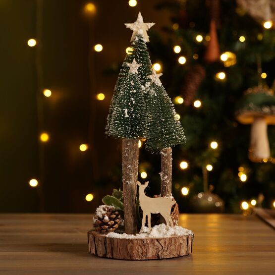 The Natural Wooden Forest Scene with Snow Effect - 24cm captures a woodland moment.