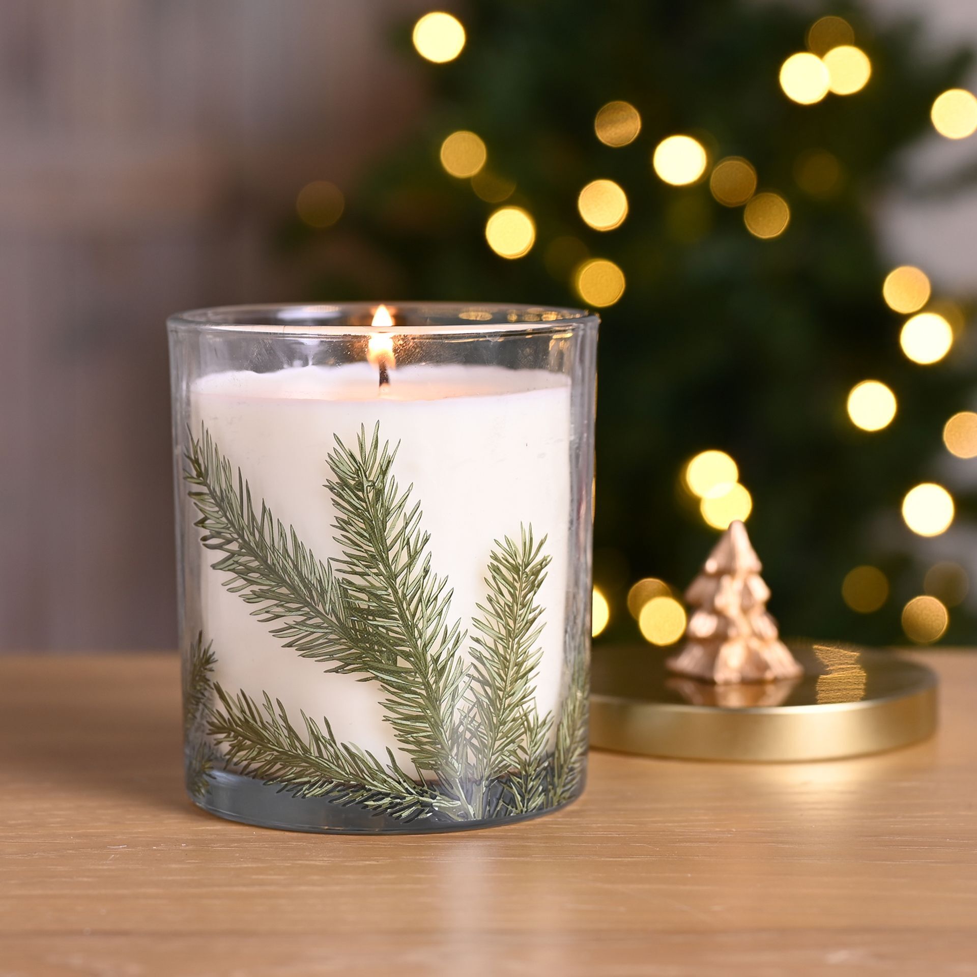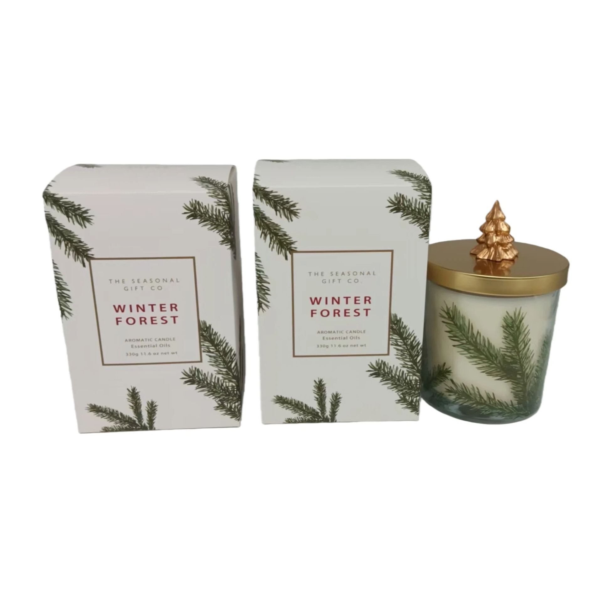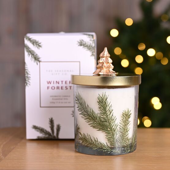 This glass candle jar with a copper-coloured lid comes in a festive box with a winter forest design. The pin pattern detail and warm tones evoke the nostalgic charm of home baking and holiday gatherings.