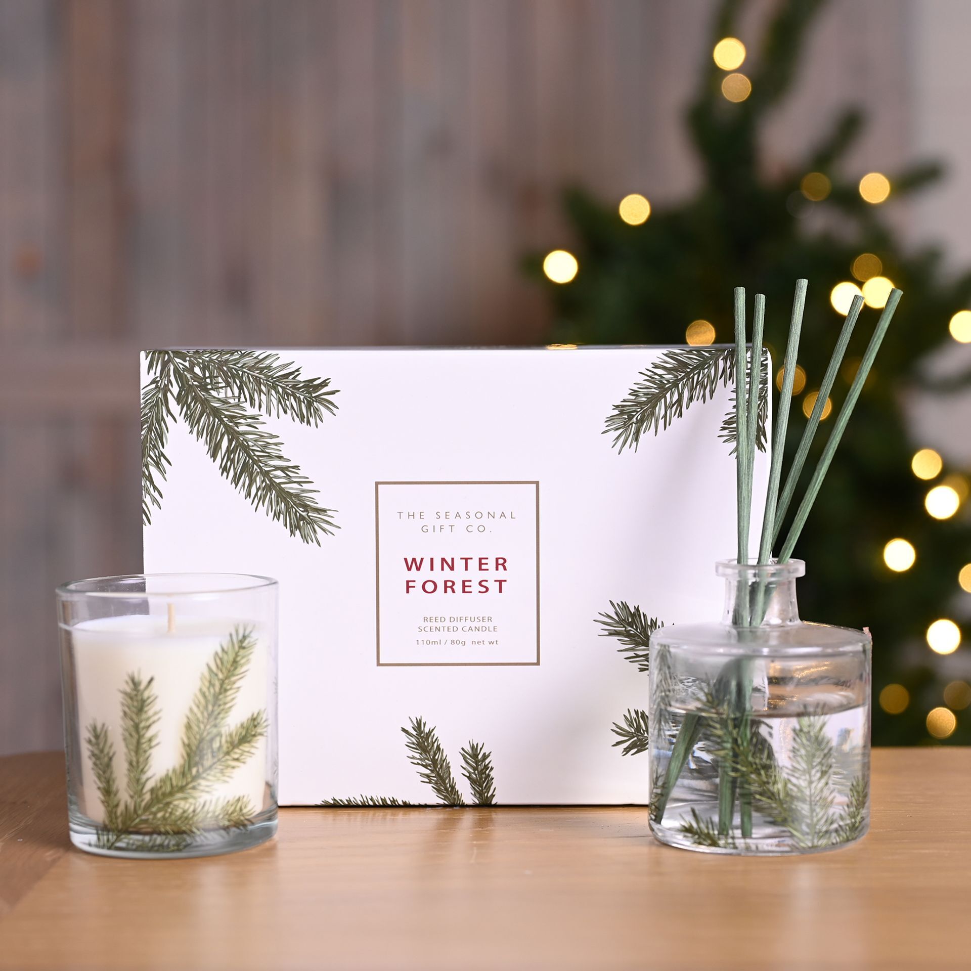 A cosy winter scene is captured with a pine-patterned candle and diffuser, presented in glass jars and a boxed packing. The design blends natural motifs with subtle Christmas charm.
