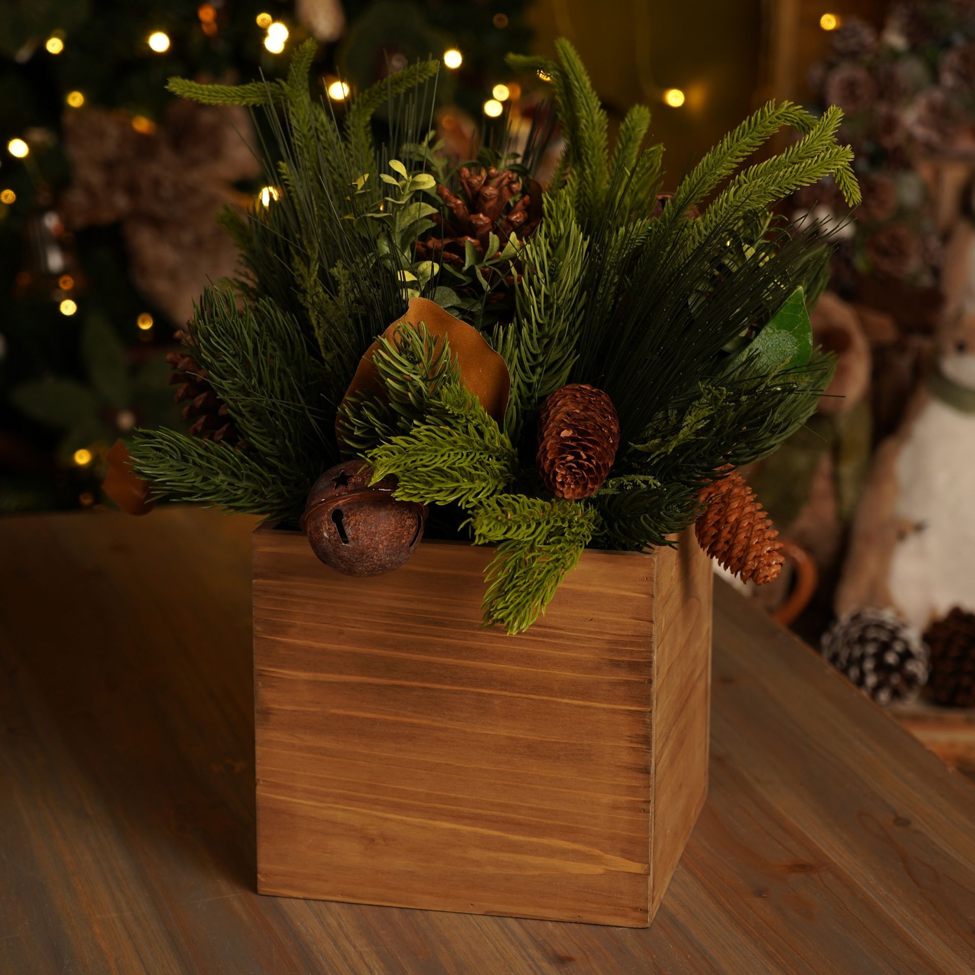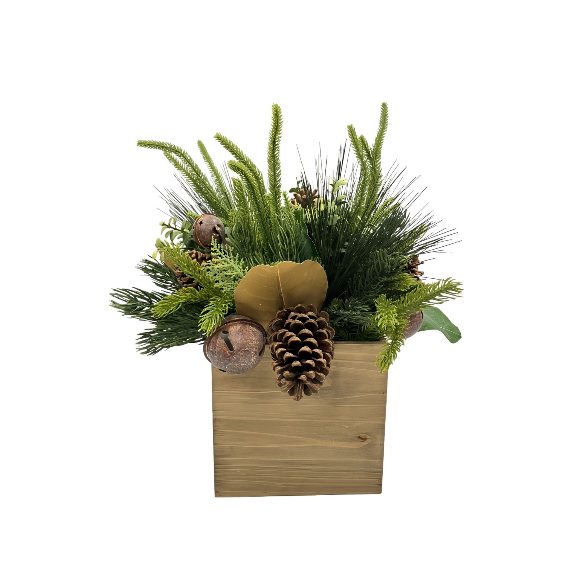 A wooden box filled with various greenery, including pine branches, grasses, and a pinecone, creates a natural and rustic holiday arrangement. Subtle metallic bells add a gentle festive accent, while earthy tones and organic textures evoke woodland charm.