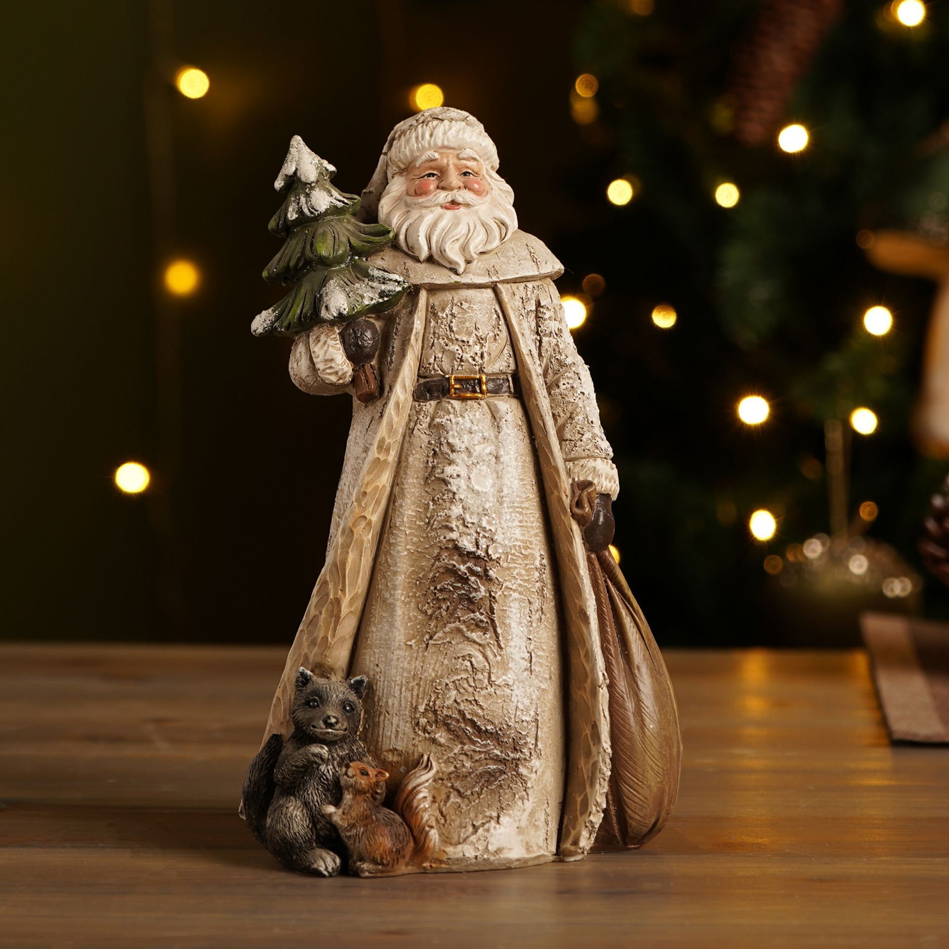 A figurine of a bearded Santa Claus wearing an ornate, fur-trimmed robe and carrying a small Christmas tree stands in warm neutral and earthy tones, with subtle organic textures lending a natural, understated charm.