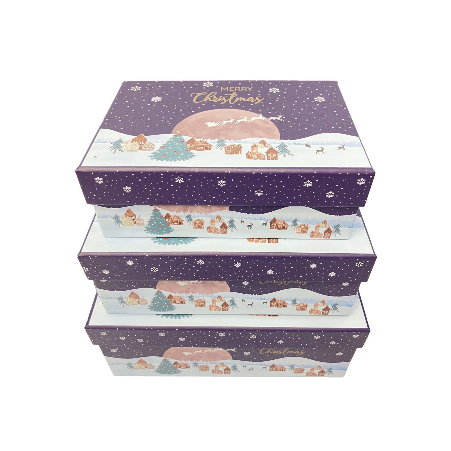 Set of 3 Merry Christmas Village Scene Paper Boxes with Hot Foil Lid - Largest Size:29x21x9.5cm