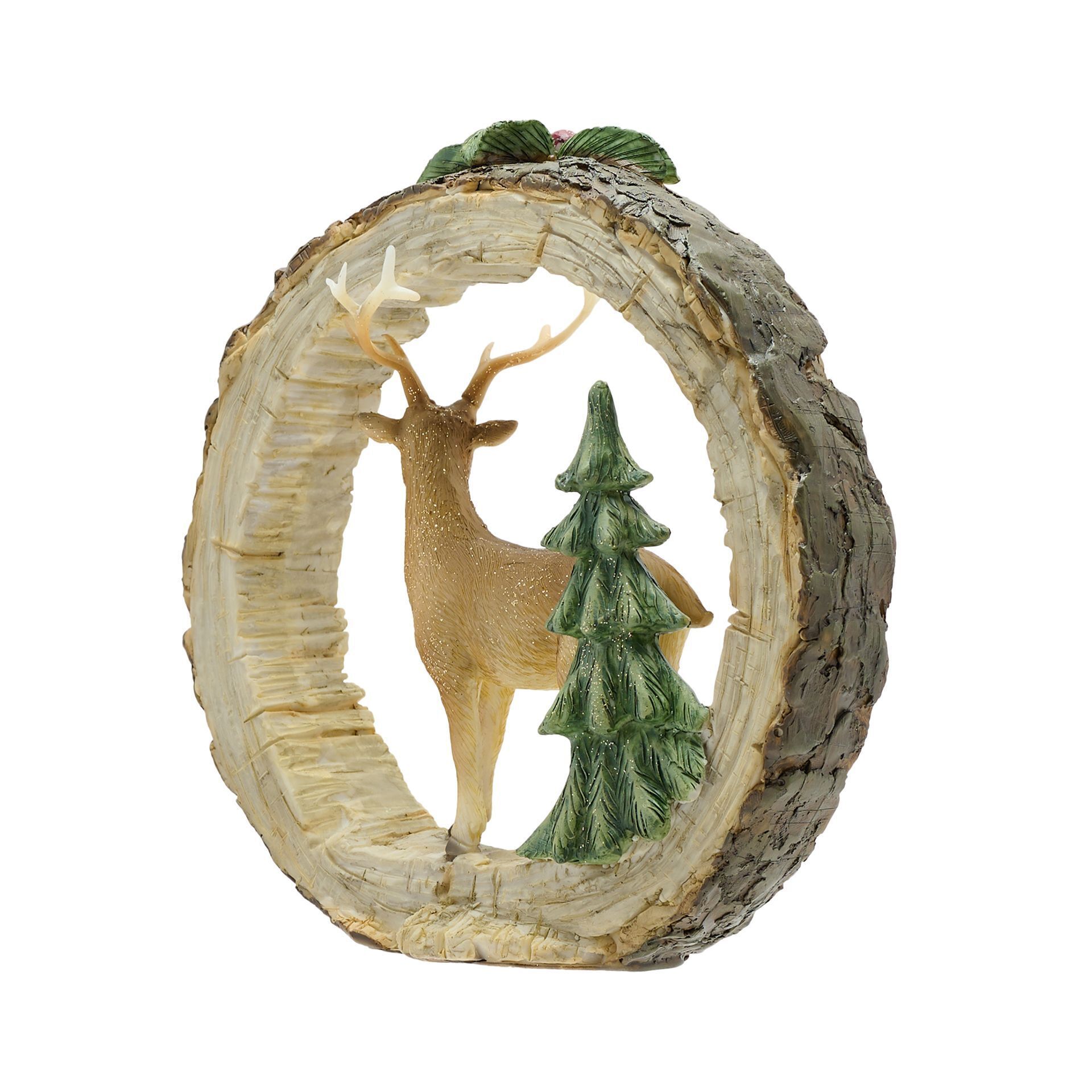 Add a festive touch to your home this Christmas with this charming standing reindeer figurine. With its sweet fawn-like face and textured wood effect frame, this delightful decoration evokes nostalgic memories of the season. The sturdy reindeer design features a red velvet bow around its neck and tiny gold bells on its antlers, bringing a hint of glamour. Mounted on a round surround with a hanging loop on reverse, this piece can be displayed on walls or shelves. Crafted from durable polyresin, it makes the perfect gift or addition to your own festive decor. Bring some magic to your home this Christmas with this enchanting reindeer ornament.
