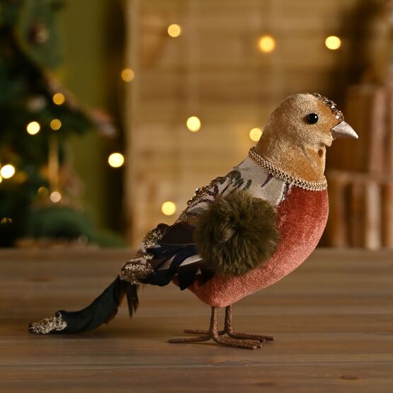 The Velvet Covered Bird Ornament with Glitter 21cm Tall introduces a charming accent to seasonal decor. A plush, ornamental bird figure is finished in rich velvet and feathers, with shimmering glitter highlights that catch the light. Subtle detailing and a gentle colour palette evoke a sense of woodland charm, while the soft texture adds warmth to any display. Complete the look with more woodland wonders from the Forest Fable collection.