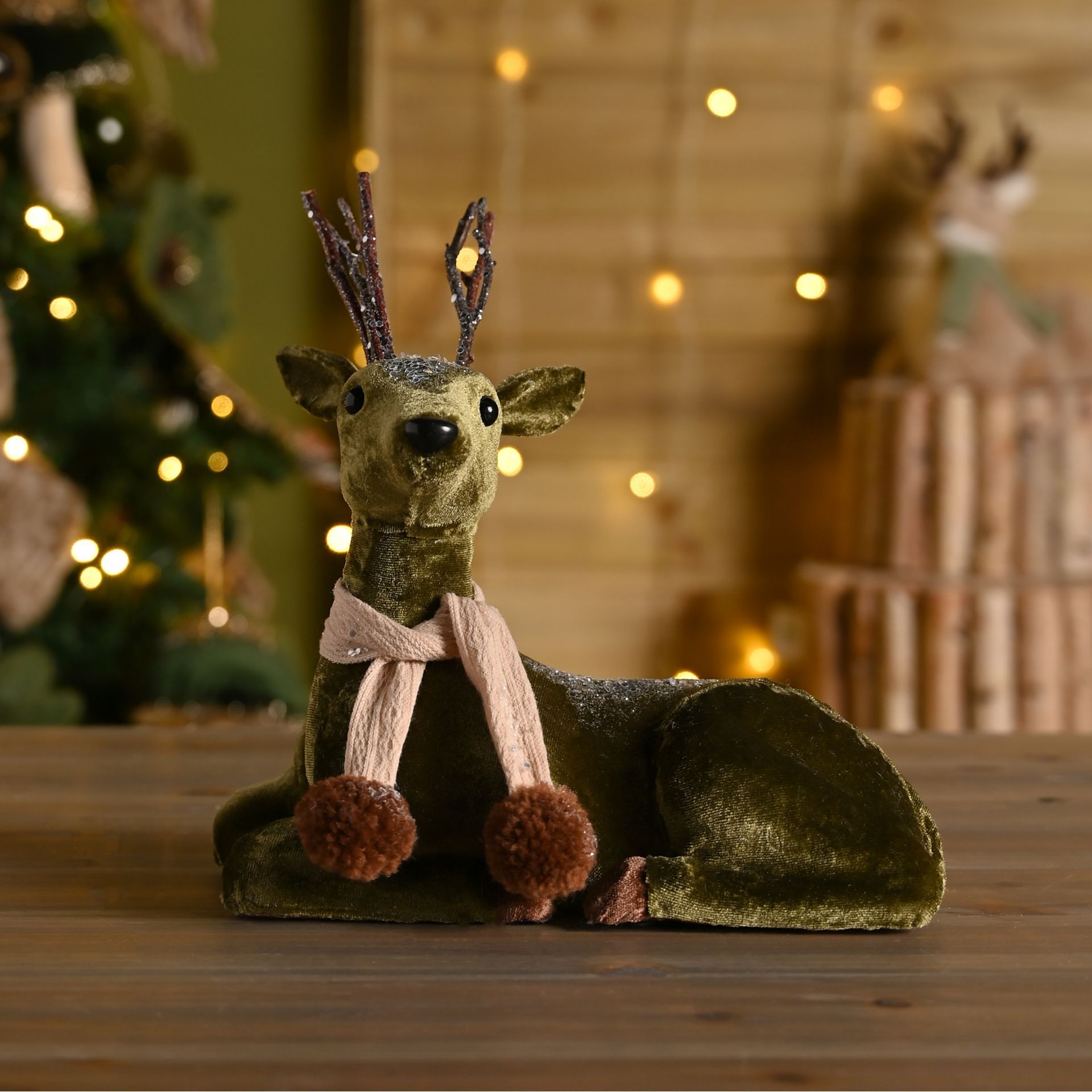 A green velvet-covered deer creature with antlers sits gracefully, with brown pom-pom scarf. The smooth covering and subtle glitter add gentle warmth and festive charm.