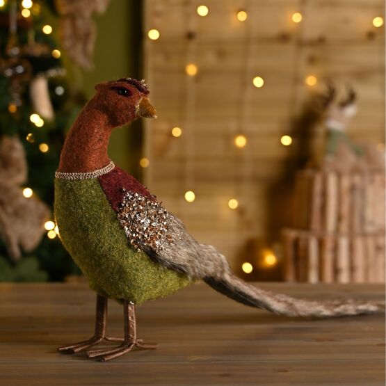 The Velvet Covered Pheasant Ornament with Glitter 25cm Tall adds a whimsical touch to festive decor with its charming, nature-inspired design. This colourful bird figurine is finished in plush velvet and accented with glitter for subtle sparkle. Capturing the woodland spirit fo Forest Fable, it blends nostalgic charm with a refined seasonal palette. Complete the look with more woodland wonders from the Forest Fable collection.