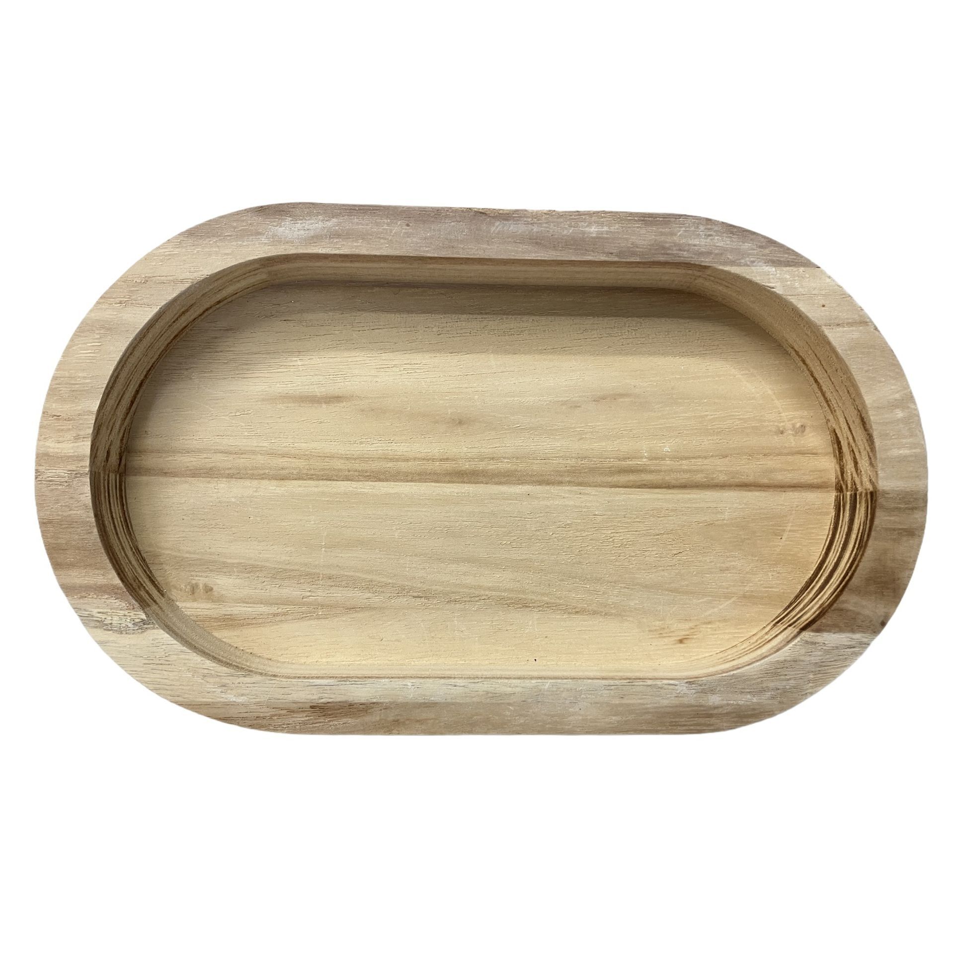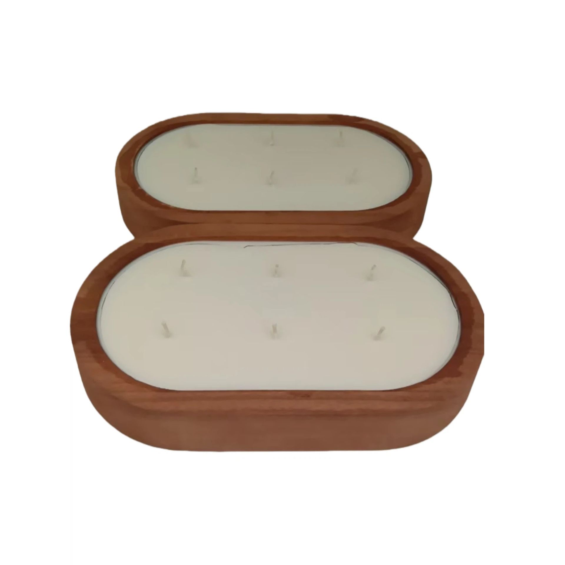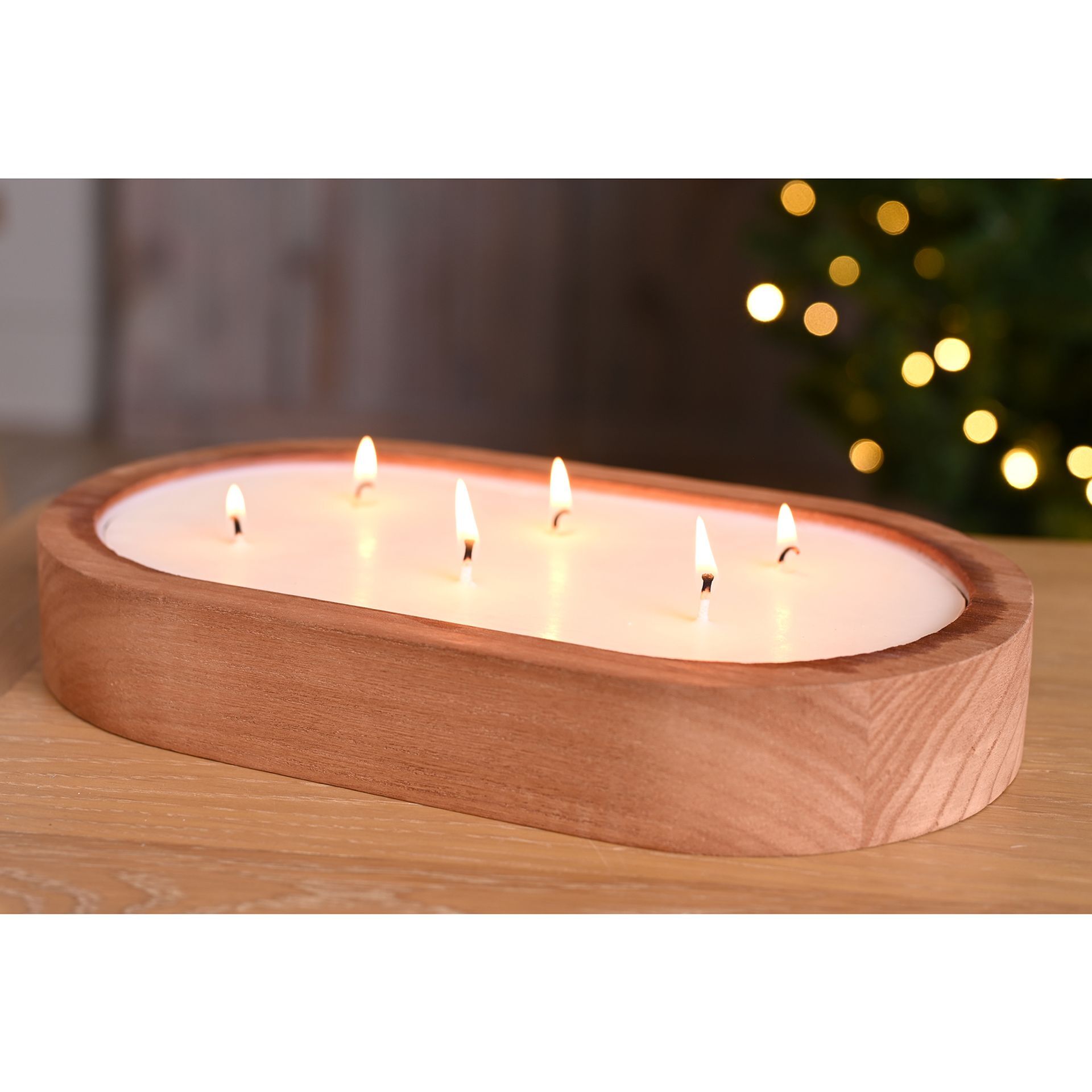 A wooden oval-shaped tray with a smooth, natural grain texture holds the candle, offering earthy tones and organic charm. The substantial wax fill ensures a long-lasting, gentle fragrance that complements cosy winter interiors.
