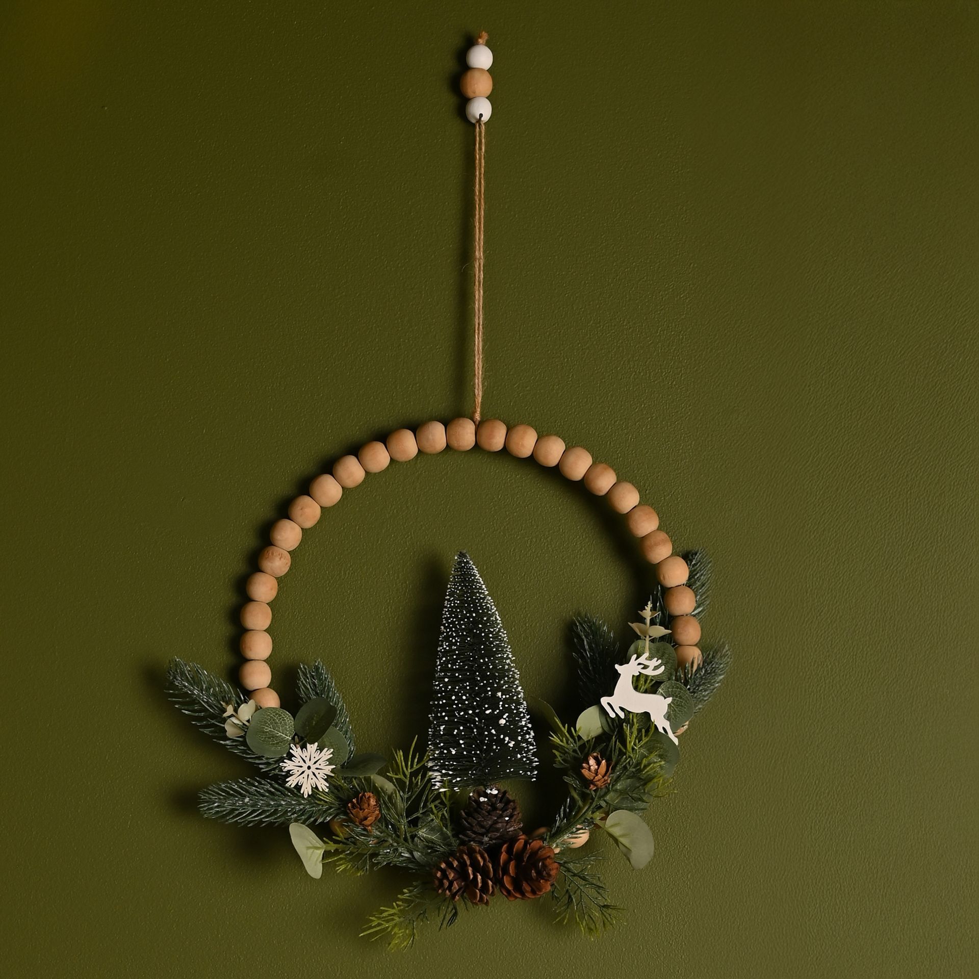 The Wooden Beaded Wreath with Faux Pine Foliage and Eucalyptus 28cm is a nature-inspired accent for festive interiors.
