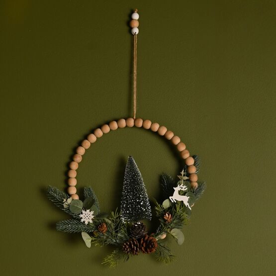 Wooden Beaded Wreath with Faux Pine Foliage and Eucalyptus 28cm