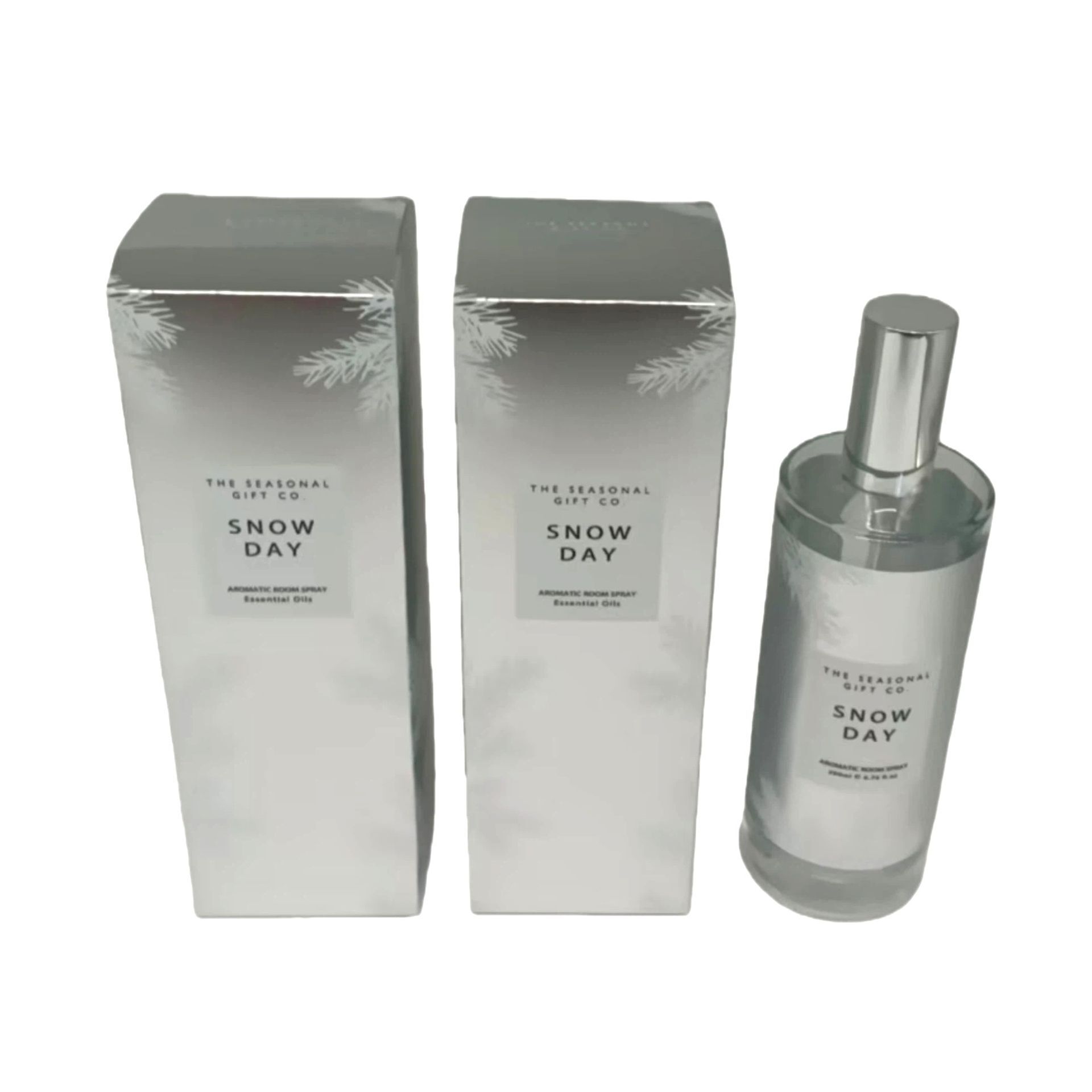 Presented in two silver-coloured boxes and a matching silver-coloured spray bottle, each piece is printed with the words "Snow Day" for a crisp, modern finish. The clean lines and subtle metallic sheen evoke the serene nature of Frosted Haven in a contemporary style.