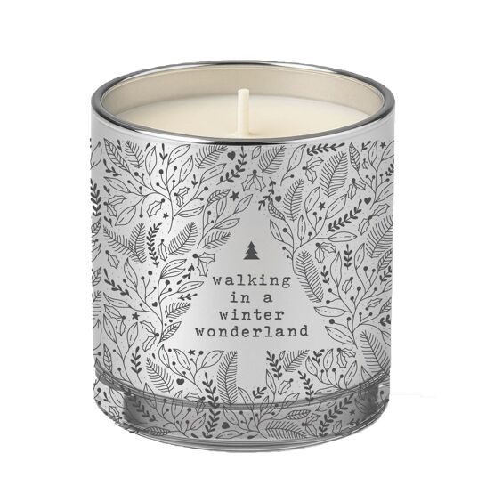 A decorative candle in a silver tin, with the text "walking in a winter wonderland" printed on it creates a gentle, festive accent. The metallic silver finish adds a subtle shimmer, complementing the soft birch scent.