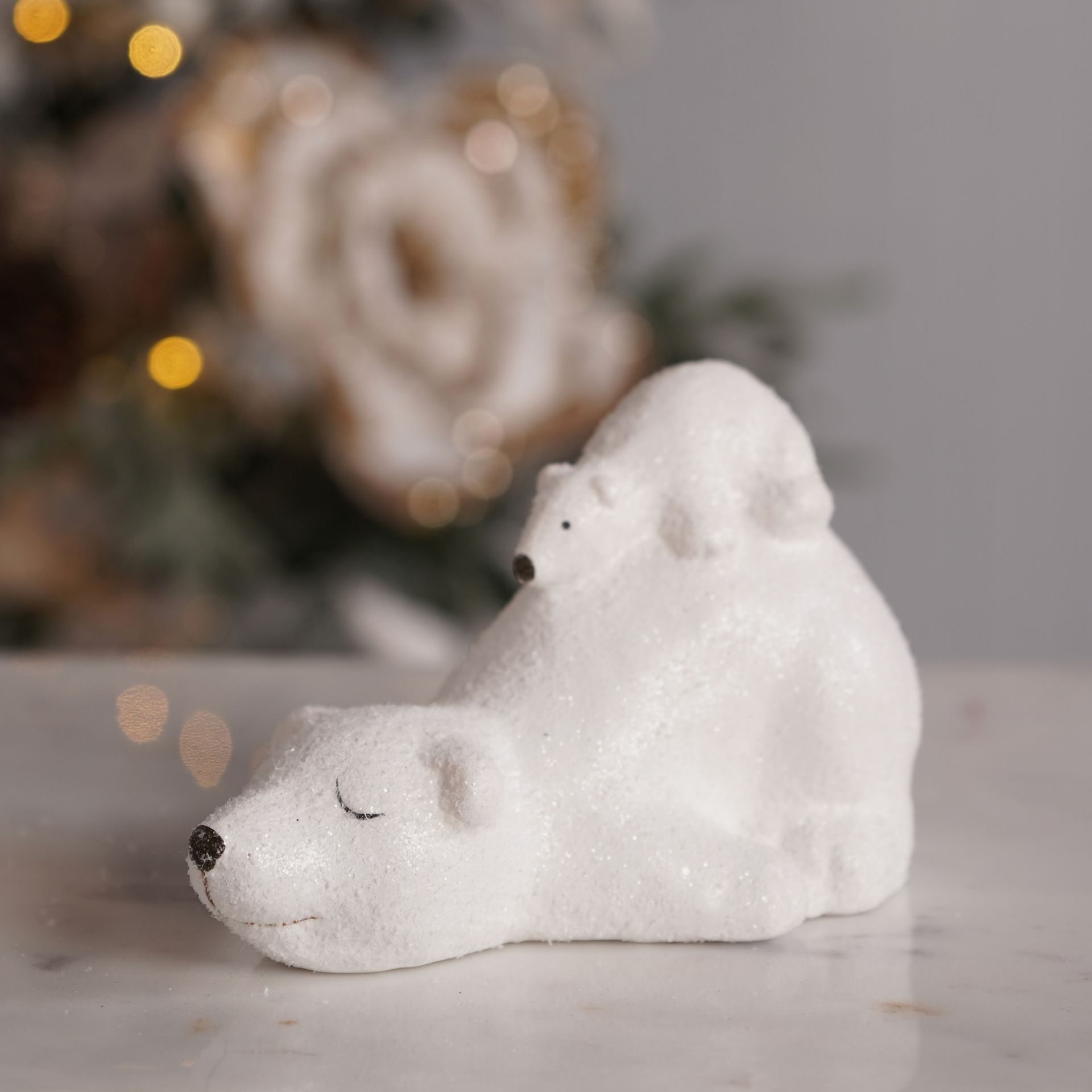 The Ceramic Snow Covered Polar Bear and Cub Lying Down 14cm offers a gentle wintry accent for refined seasonal decor.
