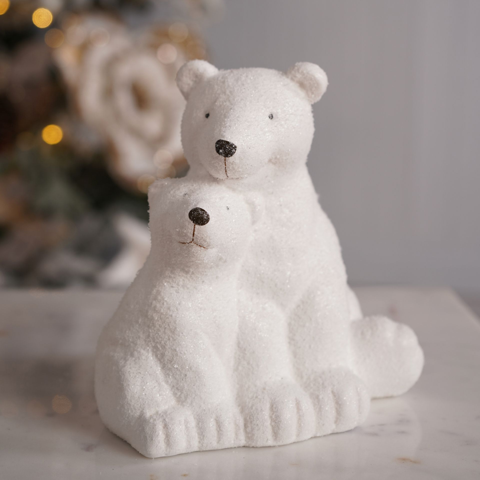 The Ceramic Snow Covered Polar Bear and Cub Ornament offers a gentle, wintry accent for festive interiors.