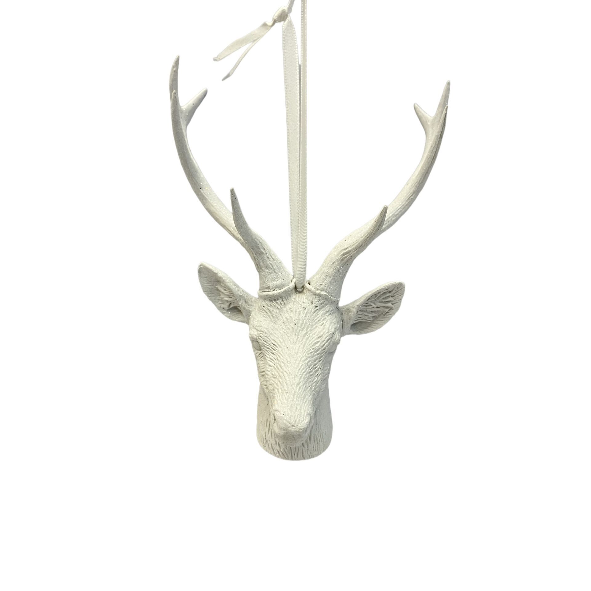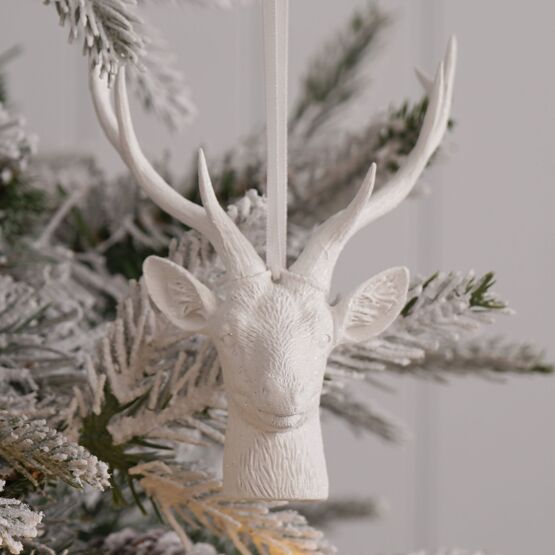The Christmas Deer Head Hanging Decoration serves as a refined focal point for seasonal interiors, adding elegance and sophistication. Featuring a white deer head with large antlers, it showcases crisp contours and a smooth, matte finish. The understated palette and graceful form evoke winter calm. Complete the look with serene, harmonious pieces from the Frosted Haven collection for a peaceful holiday setting.