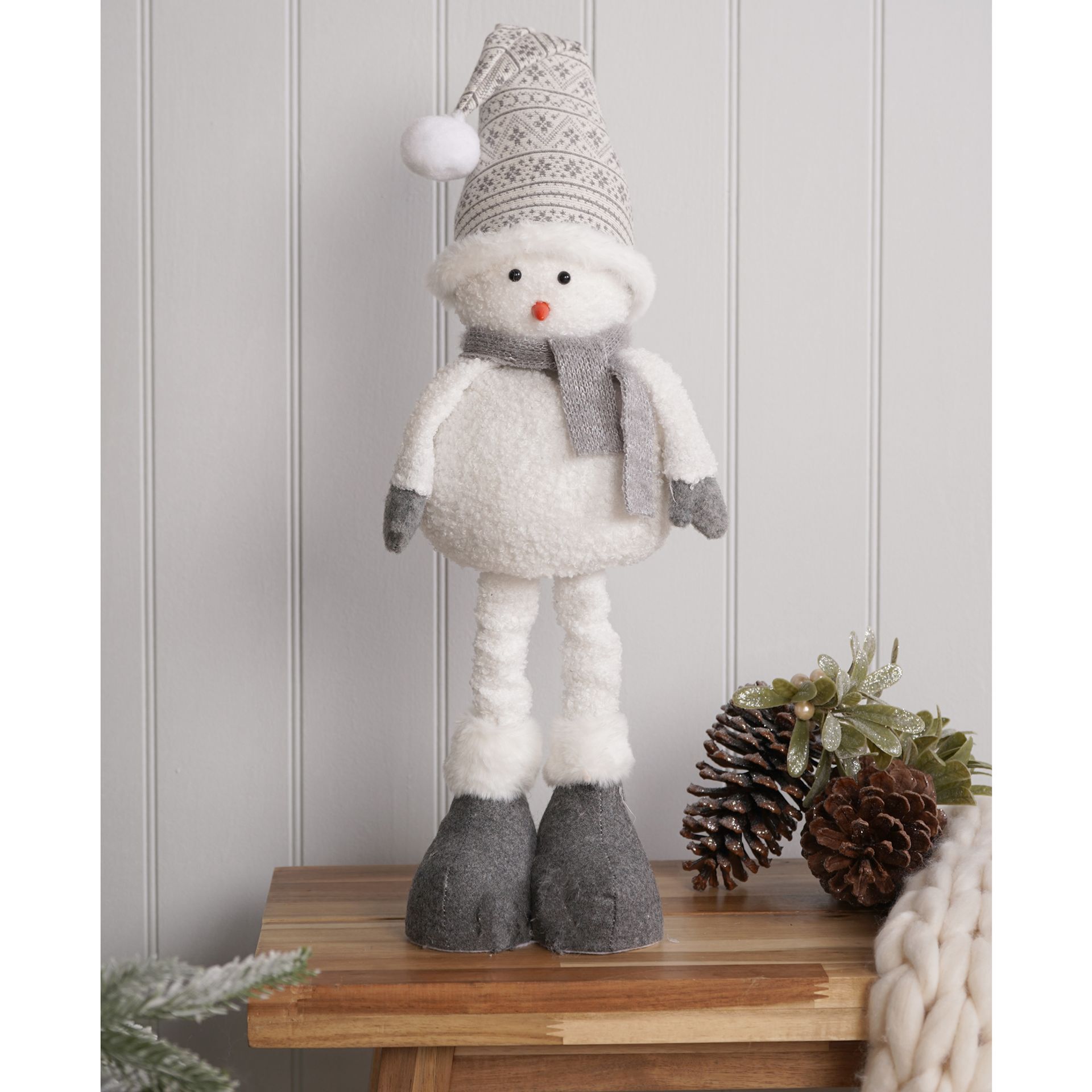 A plush, white snowman figure is dressed in a grey knit hat and scarf, with telescopic legs and skis adding a charming, contemporary twist to its silhouette. The combination of soft fabric and natural wood creates a balanced, inviting presence.