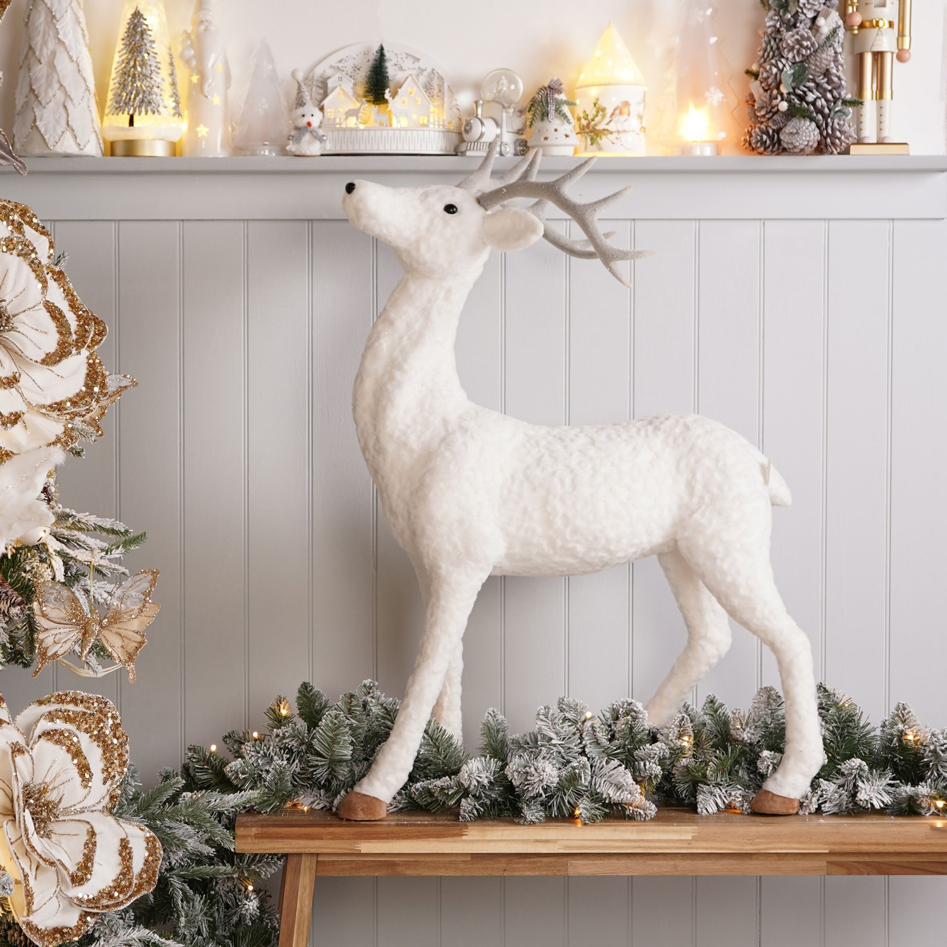 The Large Snowy White Deer 97 x 67 x 28cm stands as a striking centrepiece in the Frosted Haven collection. A fluffy white deer-like creature with grand, sculpted antlers offers a refined silhouette and gentle presence. Its plush texture and clean lines evoke a sense of calm winter elegance, making it a versatile addition to seasonal decor. Pair with other elegant decorations from the Frosted Haven range.